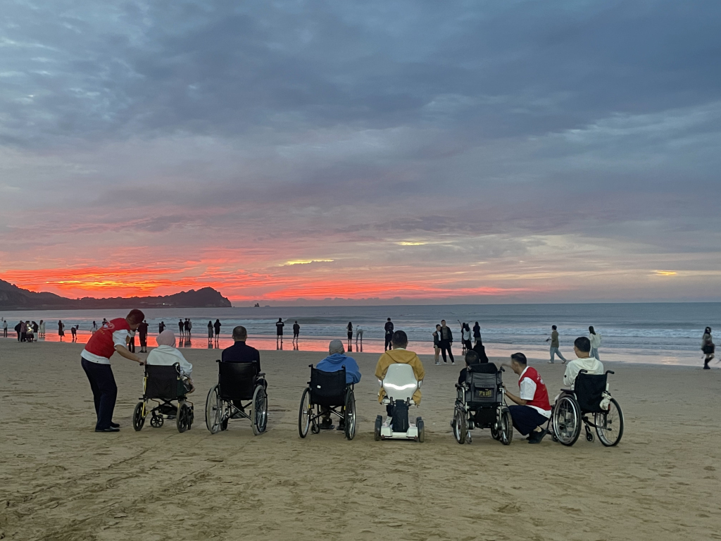 2023年9月,志愿者们陪同来自全国各地8位依靠轮椅出行的脊髓性肌萎缩症患者,在石老人海水浴场共同等待日出。当朝霞洒满海面,第一次驻足沙滩的轮椅游客们激动得热泪盈眶,欢呼声与惊叹声交织在一起。每年春节期间,501志愿服务队还参与“障碍人群春运帮帮忙”活动,为在青岛工作的外地障碍人士提供全程护送服务。从工作地点到机场、高铁站,志愿者充当他们的“眼睛”和“拐杖”,直至办好全程手续才离开。