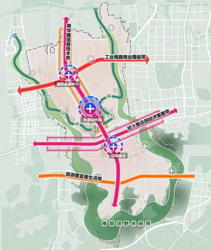 “环带筑基、十字贯通、三核引领”空间结构概念图