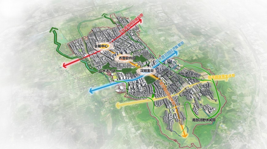 三核引领:重点打造会展中心商贸产业集聚区、齐鲁软件园数字科创区、汉峪金谷总部金融集聚区三大动能极核,辐射带动全域升级,强化“城”市的核心功能。