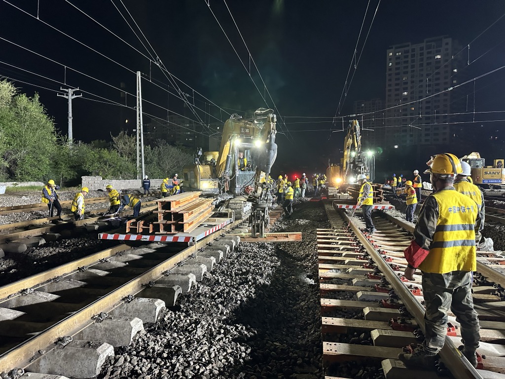 面对“时间紧、任务重、管理单位多”的复杂局面,项目团队实施“日间网格化管理+夜间精细化作业”的24小时连续施工模式。项目紧邻胶济铁路,作业空间狭窄,所有特种设备需在有限场地内交叉作业。团队将安全管控前置,白天完成交底、模拟及设备准备,把“功课”做在“天窗”之外。每天夜间“天窗”点仅有180分钟和210分钟有效作业时间,在接触网不停电、临近既有线条件下,实现10余台设备在60米狭长区域内协同作业,做到“人机分离、机机分离”,对铁路设施“零触碰”。