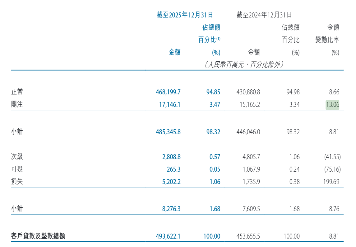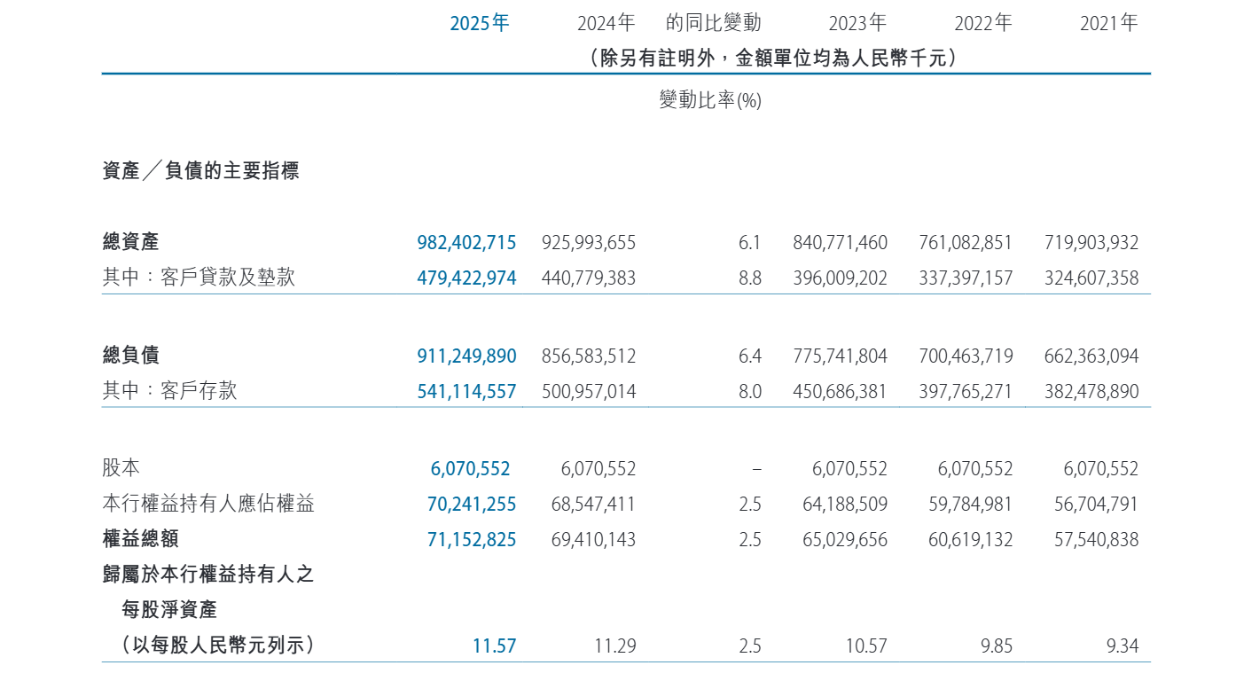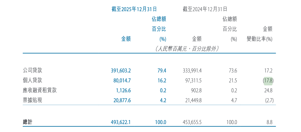 在整体存贷款规模上,截至2025年末,该行各项贷款余额4794.2亿元,较年初增长8.8%;各项存款余额5411.1亿元,较年初增长8.0%。信贷资源投放偏向对公领域,公司贷款占全行贷款比重升至79.4%。