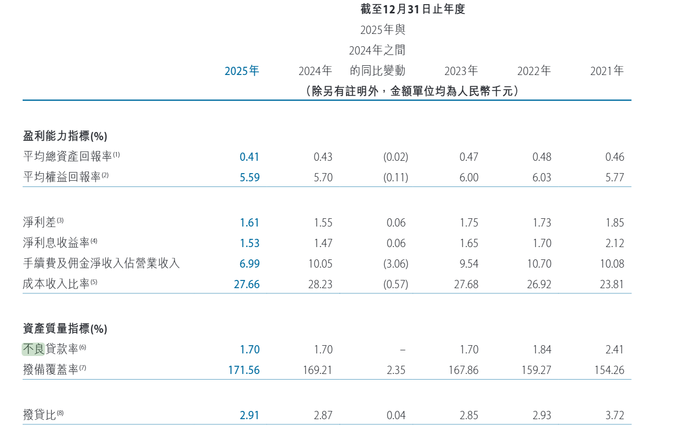 在潜在风险防控方面,截至2025年末,关注类贷款余额171.46亿元,同比增长13.06%,关注类贷款占比3.47%。全行不良贷款总额82.76亿元,较年初有所增加,后续资产质量管控压力犹存。