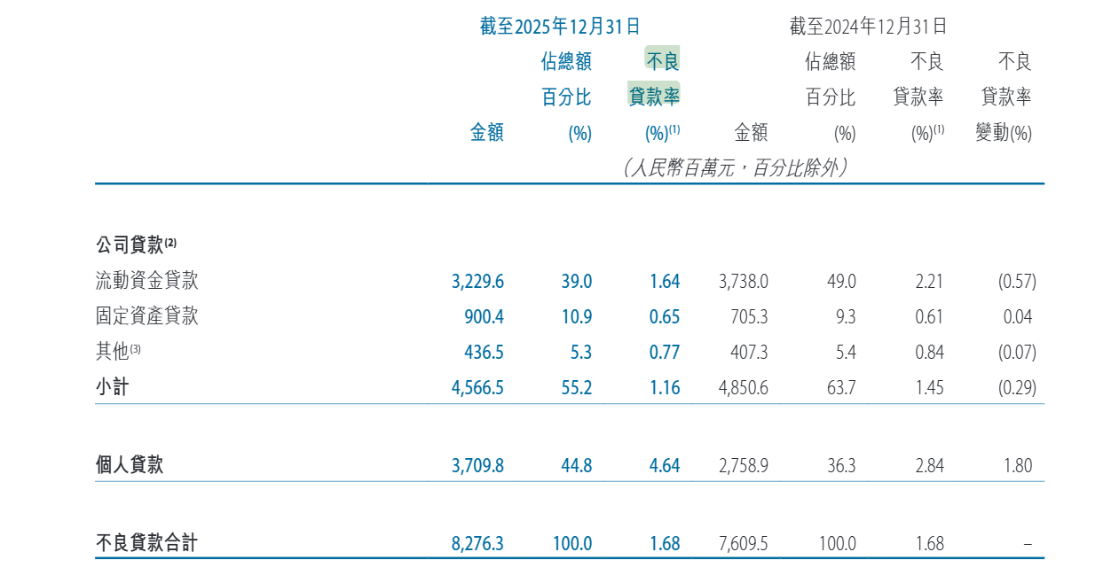 伴随零售信贷规模持续收缩,该行资产质量分化问题进一步凸显,零售端风险压力持续上升。据2025年年报披露,截至2025年末,该行整体不良贷款率1.70%,与上年末持平,资产质量细分领域分化突出。