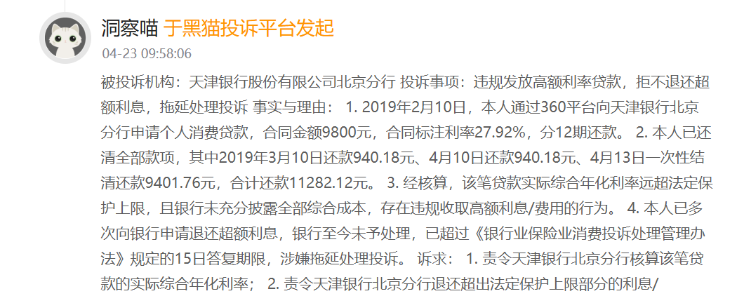 近日,记者通过梳理黑猫投诉平台公开信息了解到,目前平台关于天津银行相关有效投诉共计427条,投诉范围覆盖北京、济南、上海等多家异地分支机构。整体来看,相关投诉主要集中在联合贷款利率争议、信用卡分期服务、第三方逾期催收乱象等领域。