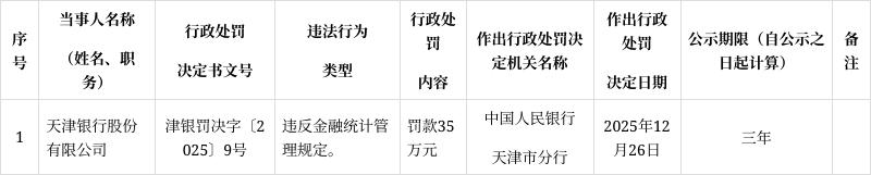 1月7日,中国人民银行天津市分行公示处罚决定,天津银行总行因违反金融统计管理规定,被处以罚款35万元。