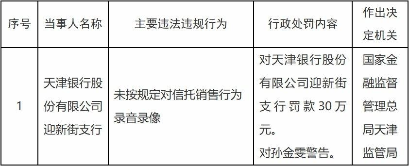 2月25日,天津监管局发布处罚公告,天津银行迎新街支行因未严格落实信托产品销售录音录像监管要求,被罚款30万元,相关直接责任人同步受到警告处罚。