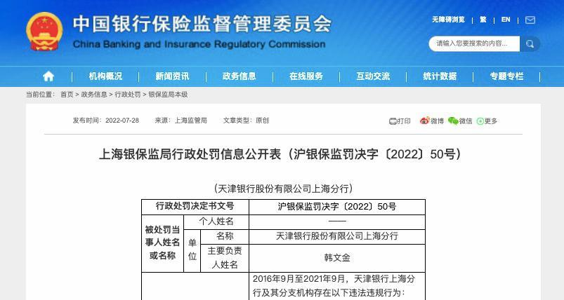2022年7月,天津银行上海分行曾因信贷管理不规范、风险分类不准确、内控管理缺失等14项违规问题,被监管部门合计罚款710万元。