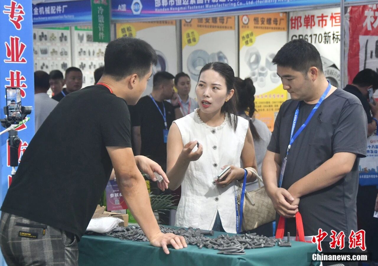 2025年9月16日,在第十八届中国·邯郸(永年)紧固件及设备展览会现场,参展商正在向采购商介绍紧固件产品。 胡高雷 摄产业转型升级持续优化