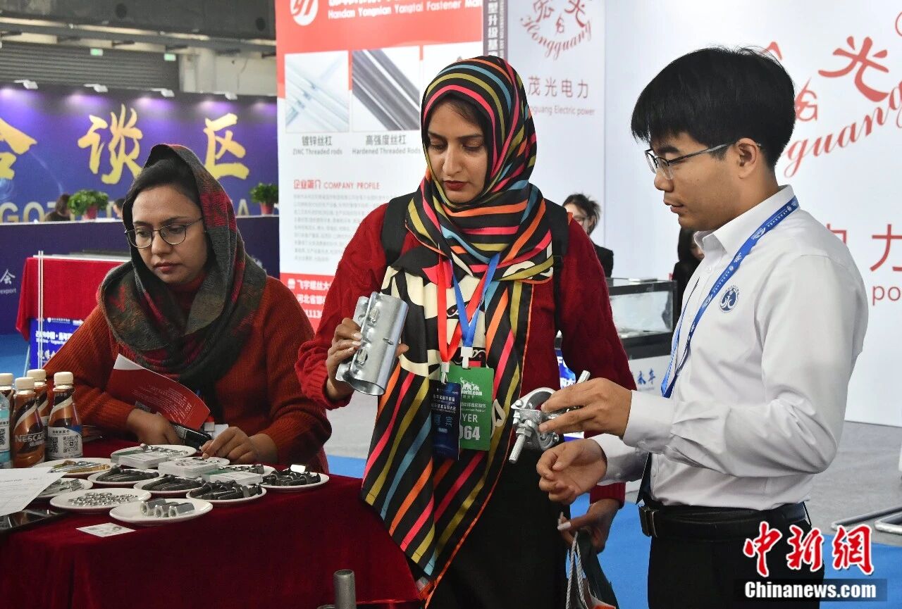 2024年10月10日,在2024年中国 永年紧固件基地国际采购大会上,外国客商(右一)正在洽谈业务。胡高雷 摄紧固件,是作紧固连接用,且应用极为广泛的一类机械零件,又被称为“工业之米”,包括螺丝、索具、异形件、建筑配件等,小到眼镜、钟表,大到轮船、飞机、桥梁等都离不开它。