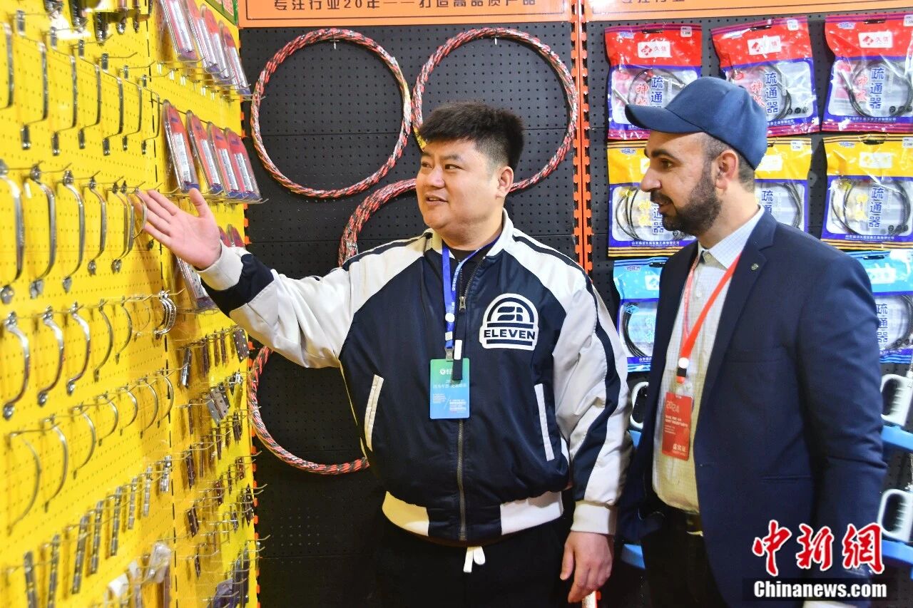 2024年2月17日,在第二十届中国 永年标准件厂商联谊暨产品展示会上,参展商向外国客商(右)推介产品。胡高雷 摄永年,这座“紧固件之都”,