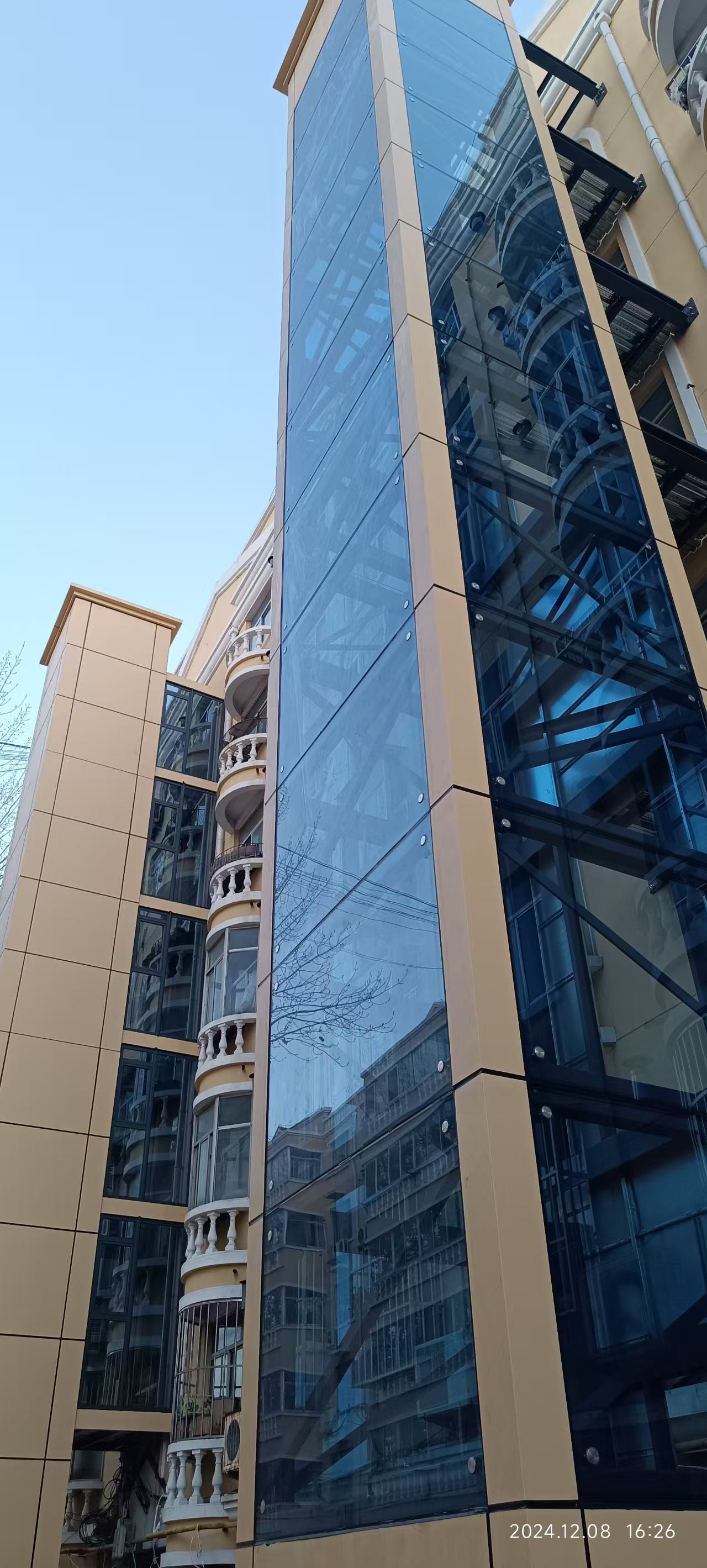 接下来是电气系统安装调试,最后是设备安装。院里堆满了设备器材,那一堆堆长长短短的钢材,一盘盘拇指粗的钢丝绳,贴着浅蓝色保护膜的大块钢板,还有一包包各种规格的螺丝钉螺丝帽,让我这个外行人看得眼花缭乱!几天后,经过工人们的一番组装焊接,这些零散的器材就变成了整体的电梯井道和电梯轿厢啦。看着轿厢这个庞然大物,想想不久我们就要站在它里面上下楼,安全有保障吗?我担心地询问施工人员,回答说,这款电梯的承重量是800多公斤,轿厢里站上10个人也没有问题呢。