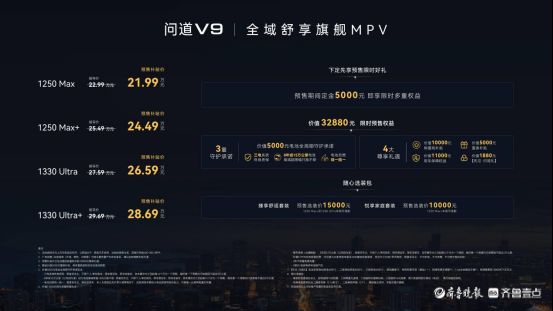 4月28日,这款承载“高端平权”使命的旗舰车型正式开启预售,预售补贴价为21.99万元-28.69万元,轻松解锁十大旗舰配置。值得注意的是,即日起下定问道V9,用户可享包含“三电系统终身质保、8年或15万公里电池衰减超限值只换不修、电池自燃烧一赔一”的3重守护承诺,以及价值10000元购置税补贴、价值5000元置换补贴、价值11000元用车保障权益、价值1880元先见·问道礼的四大尊享礼遇,限时预售权益总价值至高32880元,让消费者无需为产品溢价买单,直接坐拥全域舒享的豪华出行体验。