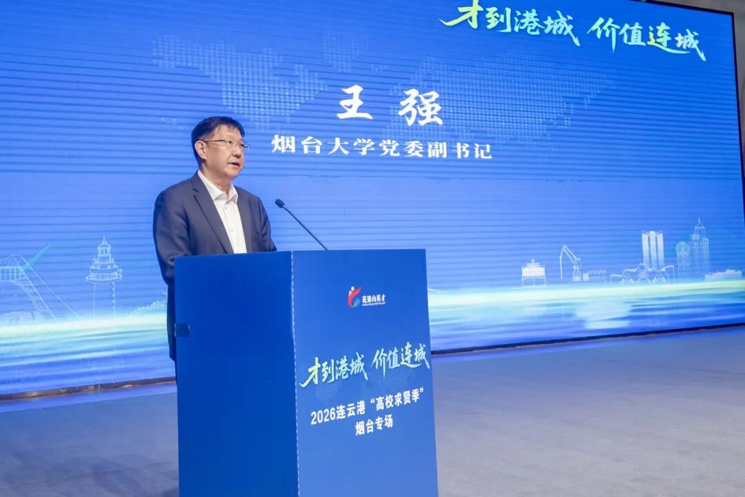 王强在致辞中介绍了烟台大学的历史沿革、办学特色和学科优势。他表示,学校学科专业布局与连云港重点产业高度契合,校地合作潜力巨大,希望以此次活动为契机,持续深化校地产学研协同创新,在毕业生实习、就业等领域为青年学子搭建更广阔的成长舞台。