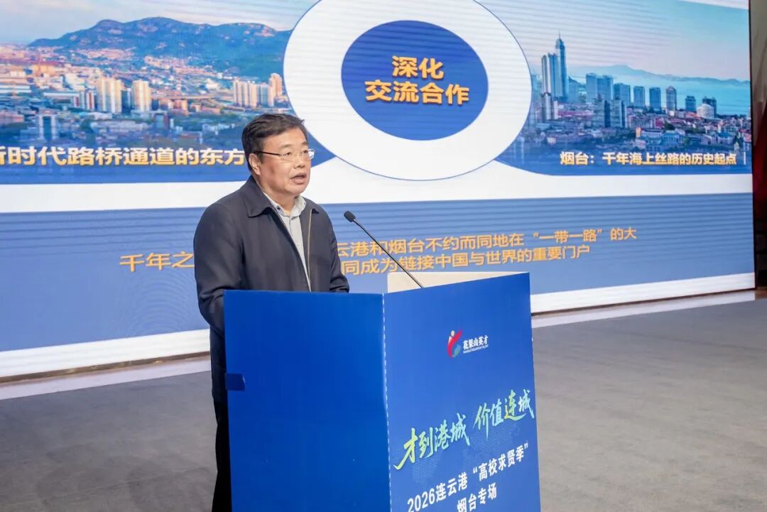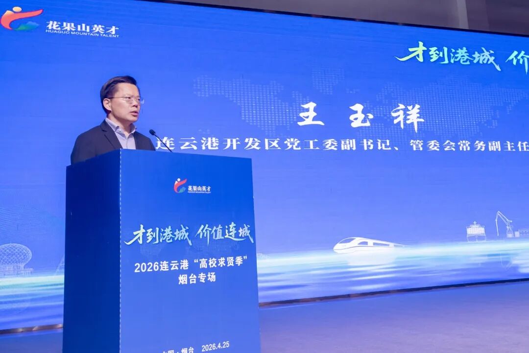 4月25日,“才到港城 价值连城”2026连云港“高校求贤季”烟台大学专场活动举办。连云港市人大常委会副主任、党组副书记、一级巡视员高美峰,开发区党工委副书记、管委会常务副主任王玉祥;烟台大学党委副书记王强,副校长王洪波以及连云港市、烟台大学相关部门负责人,鲁东大学、山东医药大学、山东工商学院、烟台理工学院等驻烟高校就业部门负责人、企业代表、2026届毕业生代表参加活动。连云港开发区党工委委员、组织宣传部部长纪岱宗主持推介会。
