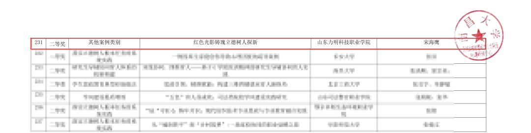 近日,由教育部高校思想政治工作队伍培训研修中心(南昌大学)主办的2026年高校学生思想政治工作优秀案例征集评选结果揭晓,山东力明科技职业学院宋海鹰教授依托学校特色的红色文化思政教育基地珍藏的10余万件红色历史文献和实物,报送的案例《红色光影铸魂 立德树人探新》荣获全国二等奖。