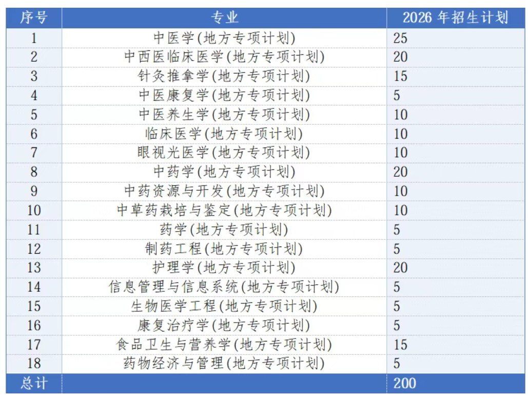 为推进脱贫攻坚与乡村振兴有效衔接,提高重点高校招收农村和脱贫地区学生比例,促进教育公平和区域均衡发展,根据《关于做好2026年重点高校招生专项计划工作的通知》(教学司〔2026〕4号)要求,2026年我省继续实施地方重点高校招收农村和脱贫地区学生专项计划(以下简称地方专项计划)。山东中医药大学严格贯彻落实上级文件精神,结合学校办学实际与人才培养需求,2026年地方专项分专业招生计划共计200人。