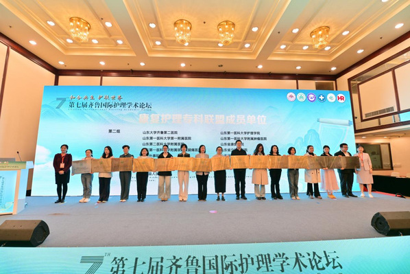 本次论坛由山东大学齐鲁医院主办,旨在贯彻落实健康中国战略和护理事业发展规划,聚焦康复护理前沿技术、临床实践创新、护理人才培养等核心议题,搭建高水平学术交流与专业协作平台,推动护理学科与前沿科技深度融合,构建智慧照护新生态,提升护理学术创新与转化水平。会上,经联盟专家组评审并现场授牌,山东外事职业大学正式加入山东大学齐鲁医院康复护理专科联盟。学校医护学院副院长刘飞飞代表学校接受联盟牌匾,标志着学校在护理专业建设、康复护理人才培养和临床实践合作等方面迈上新台阶。