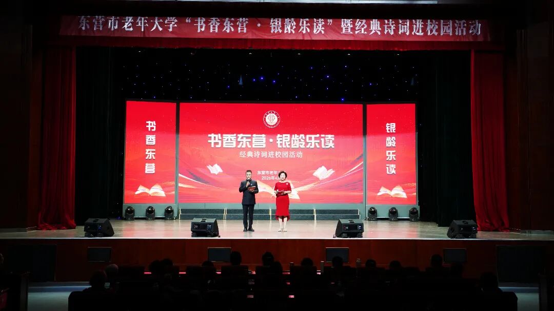 4月22日,东营市老年大学举办 “书香东营·银龄乐读” 暨经典诗词进校园活动。此次活动是老年大学助推全民阅读、共建书香东营的生动实践,活动将经典诗词朗诵与艺术演唱有机融合,为广大学员带来一场诗意与书香的文化盛宴。活动分三个篇章层层递进,从甲骨到云端,从青丝到银发,从刘集村的油灯到今天的万家灯火······让中华优秀文化在银龄舞台焕发光彩。