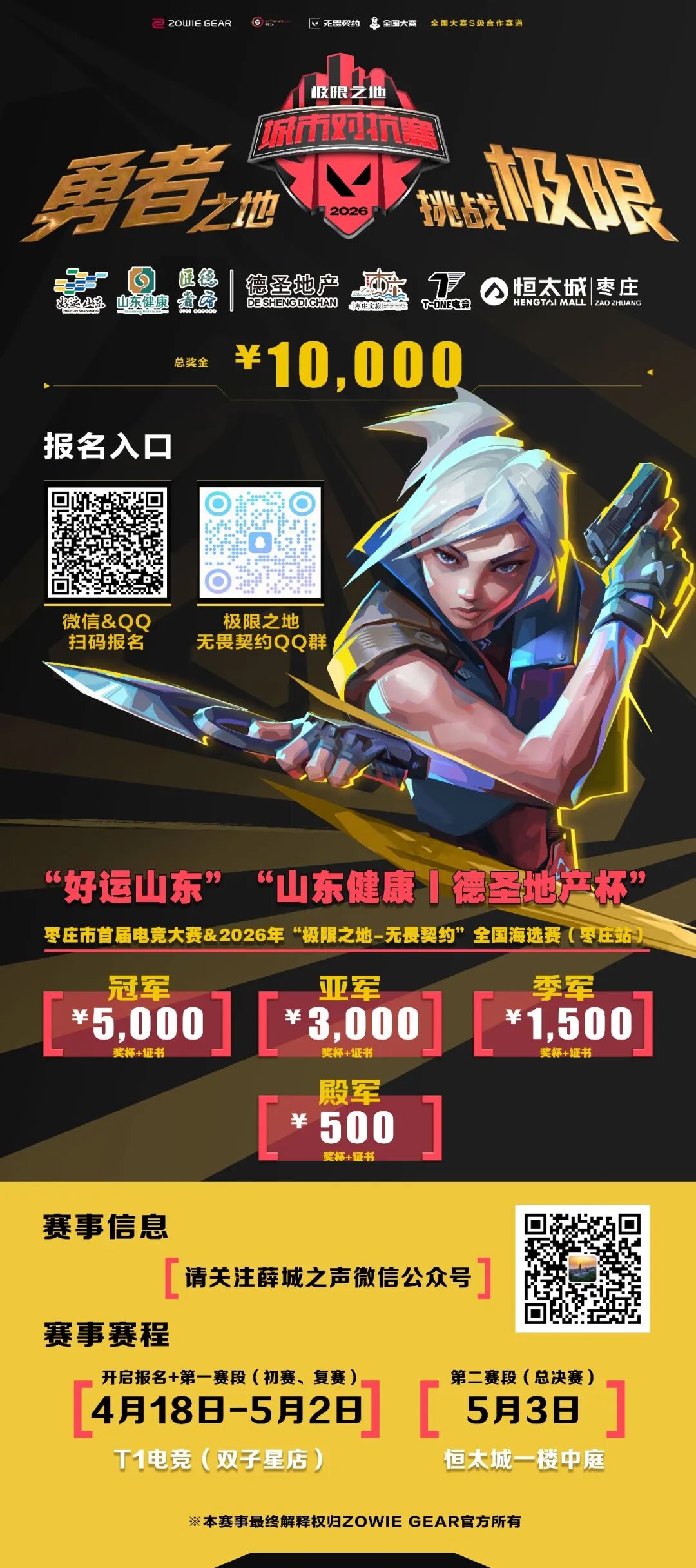 🎉第一赛段(预选赛)活动地点:枣庄市文体中心体育场4月18日—5月2日:枣庄市T1电竞(双子星店)