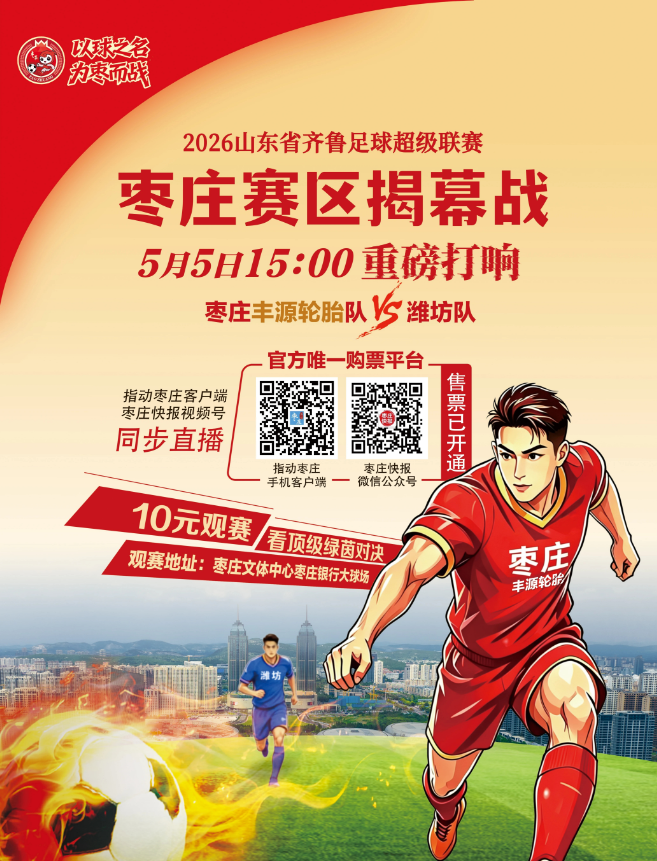 2026年山东省齐鲁足球超级联赛将于4月-10月举办,共21轮134场。主题是“齐鲁青未了,山海共荣耀”;枣庄队将以15轮完整赛程征战全省,实现与15个地市兄弟队伍的主客场交锋,枣庄队全部主场比赛均在枣庄市文体中心举办,其中主场作战7场、客场出征8场,将于5月5日在枣庄市文体中心体育场一展风采。
