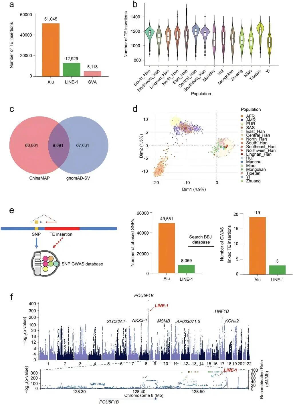 研究依托ChinaMAP队列,对10013例全基因组测序数据进行了深度挖掘,鉴定出69092个转座子插入事件,包括51045个Alu、12929个LINE-1和5118个SVA。进一步发现,转座子呈现出不同的群体分布特征:如藏族人群表现最高的插入负荷,而彝族和苗族人群则相对较低。这一结果提示,转座子活动在不同人群的遗传背景形成与进化选择中发挥了差异化作用。在与全球结构变异数据库gnomAD-SV的横向比较中,仅有约13%的插入事件为共享,展现出我国人群转座子图谱的高度独特性。通过对比1000 Genomes Project(1KGP)的非东亚样本,研究系统界定了我国人群特异性的转座子谱系,结果显示高达88%至92%,为我国人群特有。这一结果表明,构建我国人群转座子图谱在精准医学研究及复杂疾病遗传解析中具有不可替代性。进一步,通过将转座子插入与邻近单核苷酸多态性(SNP)进行连锁分析,成功识别出22个与疾病显著相关的候选插入位点,从而为揭示非编码区结构变异如何通过调控顺式作用元件驱动复杂疾病提供技术支撑。