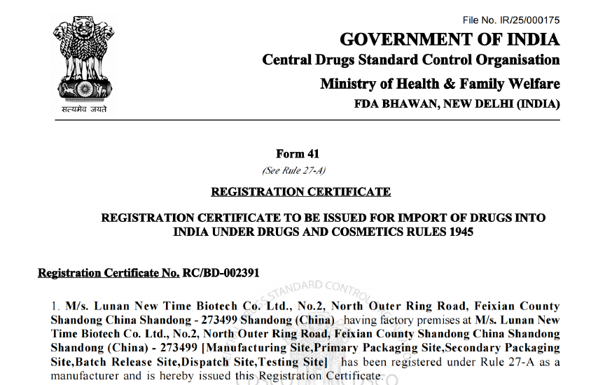 近日,鲁南制药集团鲁南新时代生物技术有限公司收到了印度DCGI(全称Drug Controller General of India,印度负责药品监管的最高行政机构)签发的米格列醇药品注册证书,这是继年初米格列醇新工艺原料药获得韩国MFDS批准后该产品新工艺的又一次获批。