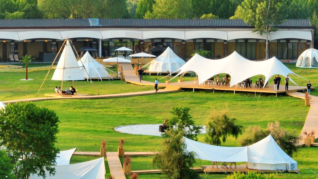 大片草坪向湖边铺展,帆船帐篷错落其间。天幕下,有人喝着咖啡看书,有人轻声聊天,更多人只是望着湖面发呆——这里的“慢”,是被精心设计过的松弛。“我们规划了28个功能区域,核心只有一个——让露营变得触手可及、舒适体面。”运营经理孙思佳说。围绕“产、学、游、乐”四大主题,基地联动文博、演艺机构举办音乐节、艺术节等活动,构建起完善的营地服务网络。