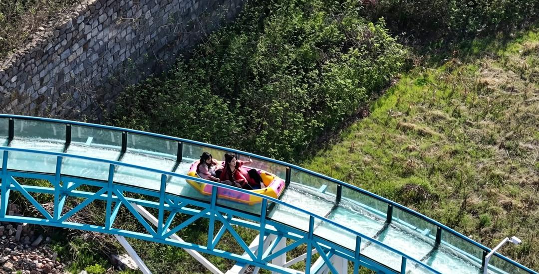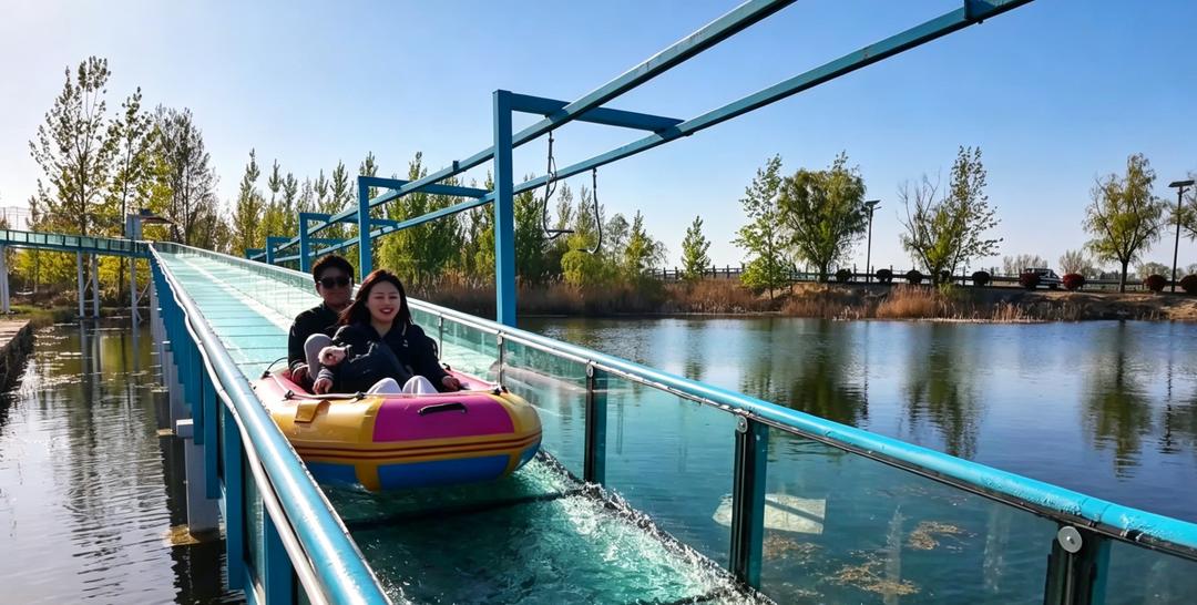 望湖阁北侧,200㎡的高空观景台已经聚满游客。360°全景视野下,微山湖碧波浩渺,船只如星点散落。全长950米的玻璃滑道就从这里出发,串联起望湖阁与生态荷园两大地标,多层钢化夹胶玻璃搭配防滑槽、防撞护边,安全感拉满。橡皮艇俯冲而下,失重瞬间引爆一片惊呼。S弯与缓漂段交替登场——时而急转直冲,浪花追着船舷跑;时而悠然滑行,风声从耳畔温柔过。低头,透明玻璃下绿植飞速后退;抬头,万里碧空如洗,偶有白鹭掠水而过。上览天光、下瞰湖色,这份俯仰之间的震撼,是传统观景方式给不了的。