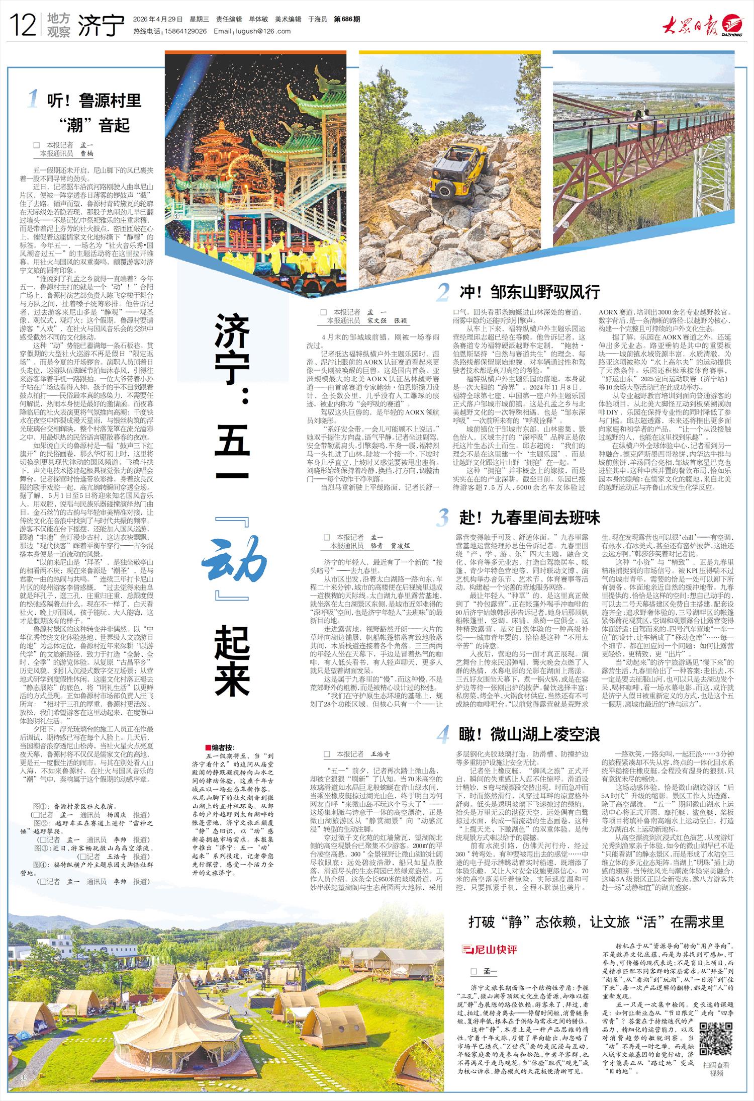 “以前来是‘拜圣’,现在是‘潮圣’。”连续三年打卡的郑州游客李倩说,“白天看社火、晚上听国风,孩子能玩、大人能嗨,这才叫度假。”从“静态展陈”到“全龄度假”,鲁源村的转型并非偶然。正如景区负责人所言:“相对于三孔的厚重,这里更活泼、放松,希望游客在度假中体验明礼生活。”与其在别处看人山人海,不如来尼山脚下,在社火与国潮的律动中,奏响你的假期动感序章。这个五一,曲阜“潮”你递出了新名片——你,接吗?