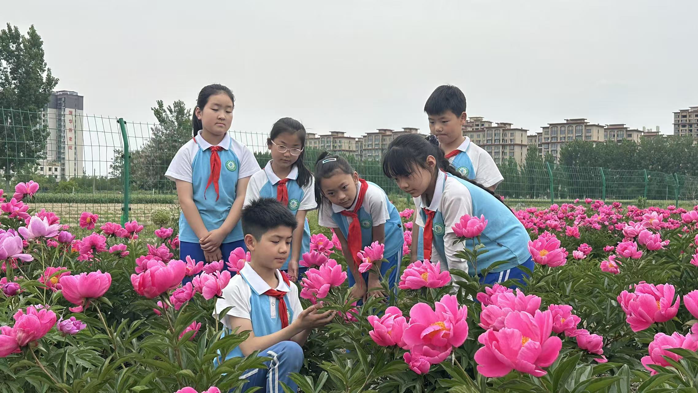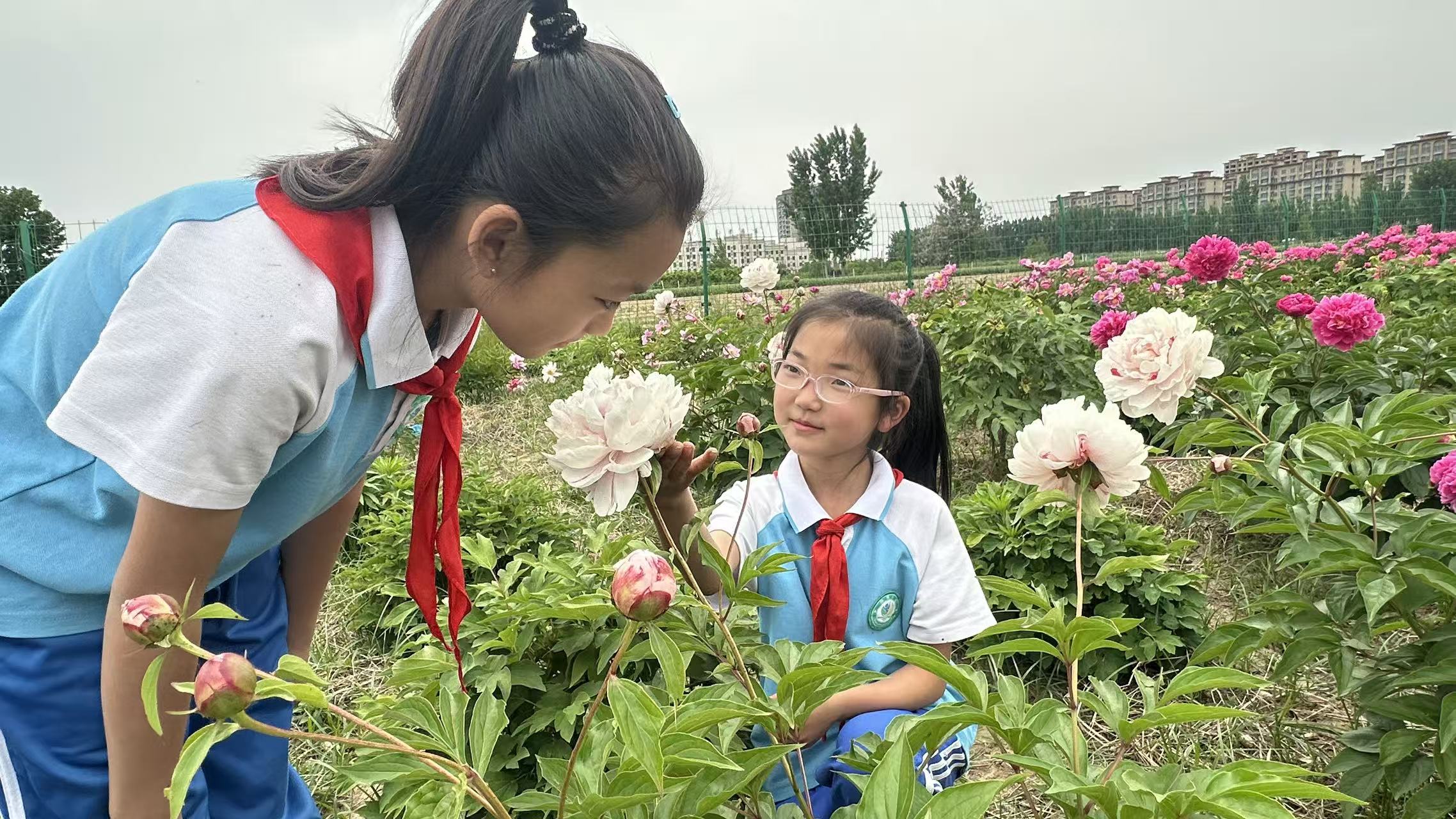 菏泽鲁西新区陈集镇陈集小学少先队员观赏劳动基地芍药花