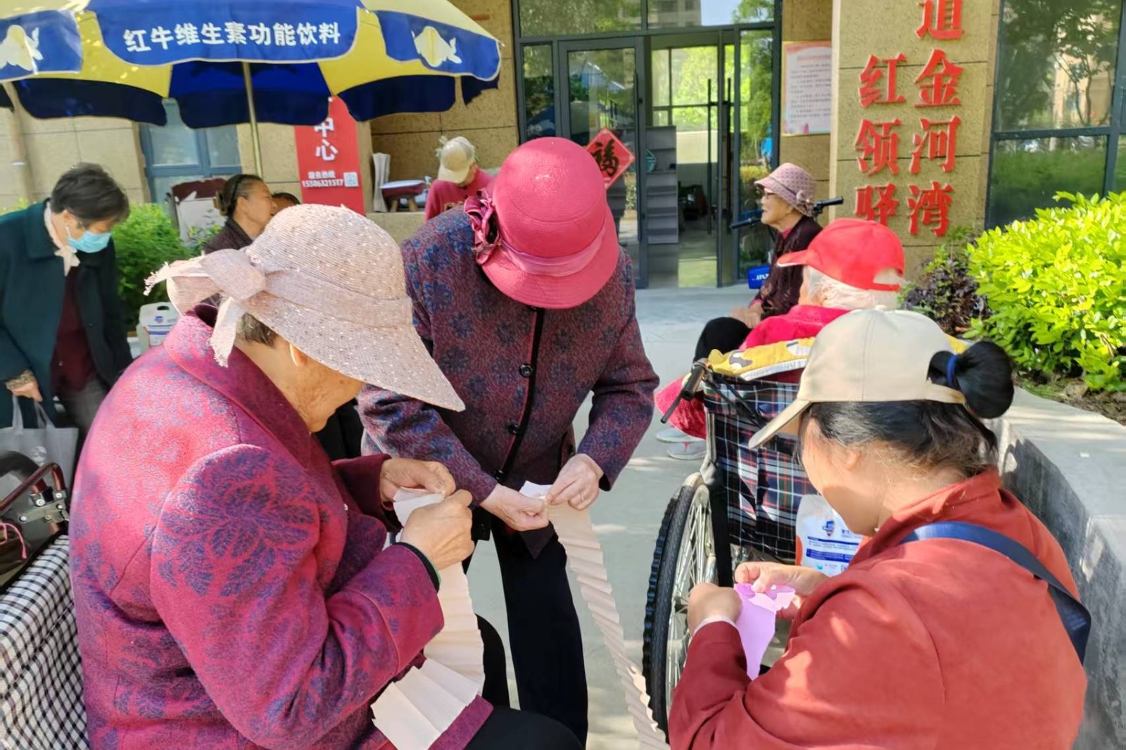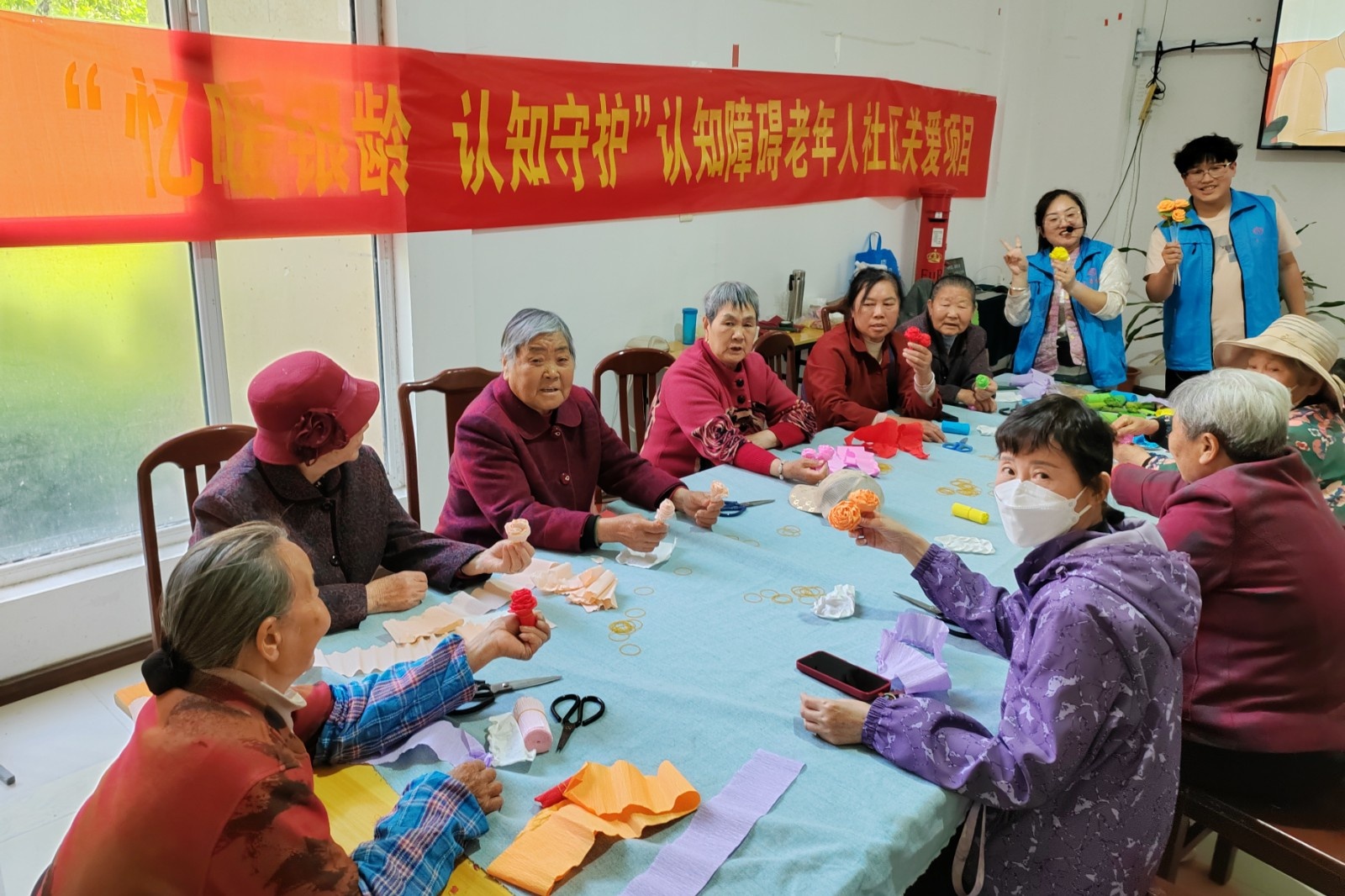 科普结束后,趣味手工制作活动正式开启。志愿者提前准备好色彩丰富的皱纹纸、剪刀、胶水等手工材料,细致讲解花朵制作步骤,手把手指导老人们折叠、裁剪、塑形、粘贴。老人们兴致高昂、积极参与,认真跟随步骤动手制作,相互交流技巧、互帮互助,一张张彩纸在手中变成精致生动的纸艺花朵。大家在指尖劳作中锻炼手眼协调与思维能力,在欢声笑语中拉近彼此距离、收获满满成就感,有效缓解孤独情绪,拓展社交圈子。