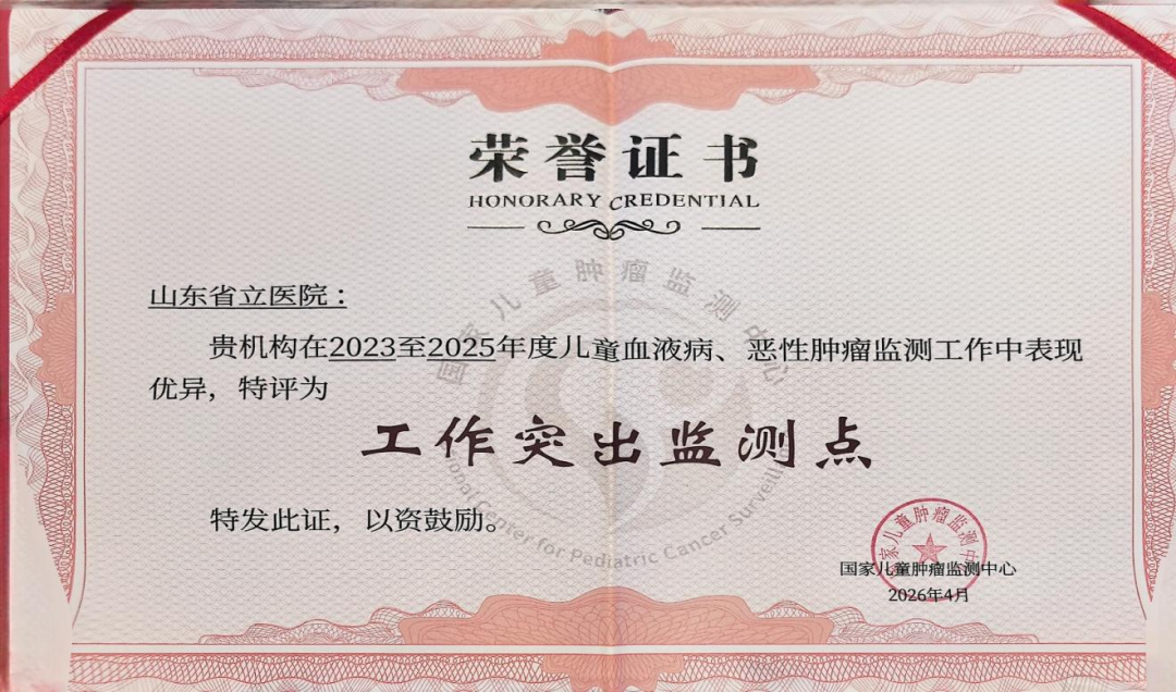 国家级认可!山东省立医院获评全国儿童血液肿瘤监测工作突出监测点