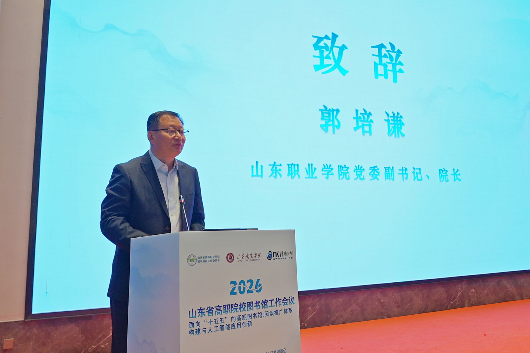 山东职业学院院长郭培谦作为承办方代表致辞,他介绍了学校在特色阅读空间建设方面的丰硕成果,重点分享了“山栀花开”火车书吧的建设经验,并向全省高职院校发出倡议,呼吁各方以阅读赋能技能提升、以文化涵养工匠精神,共同打造具有山东职教特色的书香校园品牌。