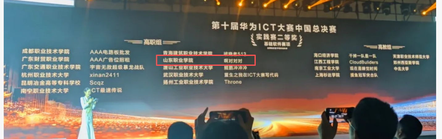 近日,第十届华为ICT大赛中国总决赛在华中科技大学圆满落幕。山东职业学院新一代信息技术学院大数据技术专业学生尹宏昊、孙俊杰、孙瑞朋组成的参赛团队,在聚焦欧拉操作系统、高斯数据库、鲲鹏应用开发等“卡脖子”核心技术的基础软件赛道上奋勇争先、表现突出,获全国总决赛二等奖。