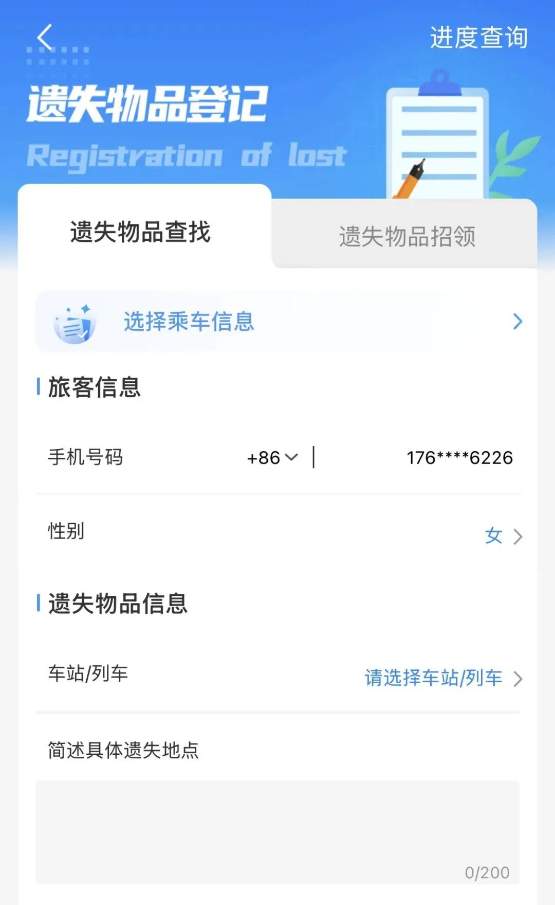 车站、车次信息以及遗失物品的特征