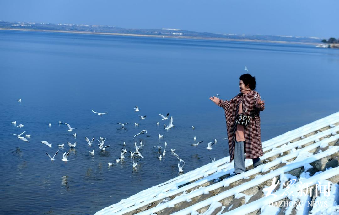 游客在丹江口水库附近观看红嘴鸥。