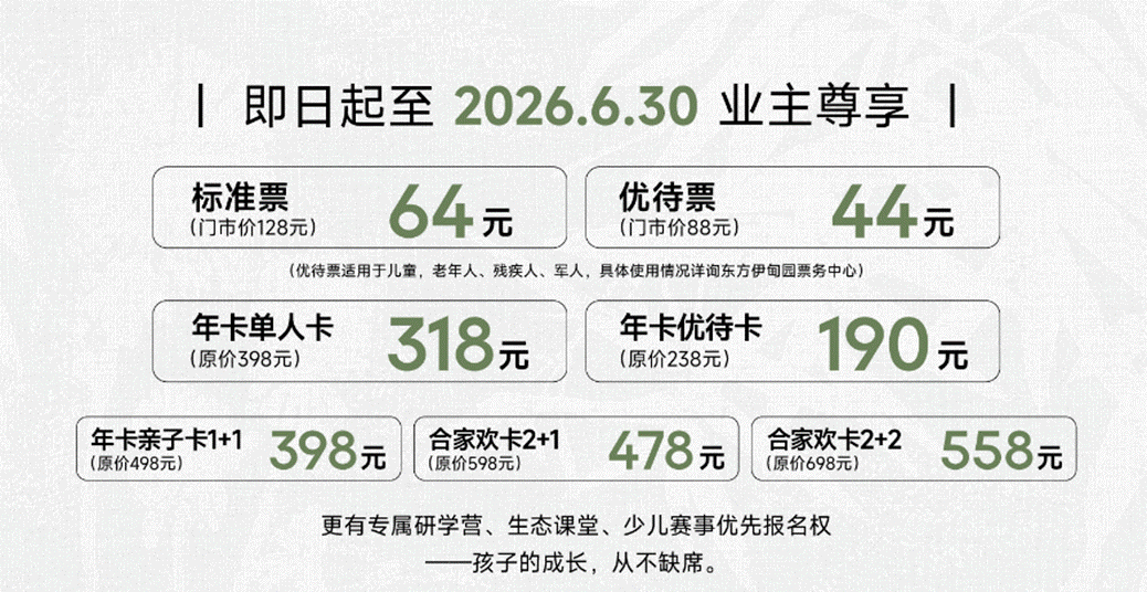 在东方伊甸园,金茂业主可享门票专项优惠:标准门票及优待票(以景区公示价格为准)可享低至5折购票权益。同时,业主专享年卡办理优惠,相较于市场价最高可节省140元。该权益于2026年4月22日已正式实施,具体执行细则可详询东方伊甸园票务中心。