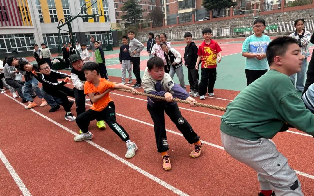 五年级开展了热血拔河比拼。粗粗的长绳像一条大蟒蛇躺在操场中间。各班选手握紧绳子,脚蹬着地,身体往后一仰,一个个脸憋得红扑扑的。哨声一响——“一二!一二!”口号声震天响。绳子中间的红绸子像个调皮的小精灵,一会儿飘向左,一会儿晃向右。拉拉队扯着嗓子喊:“拉——使劲——!”