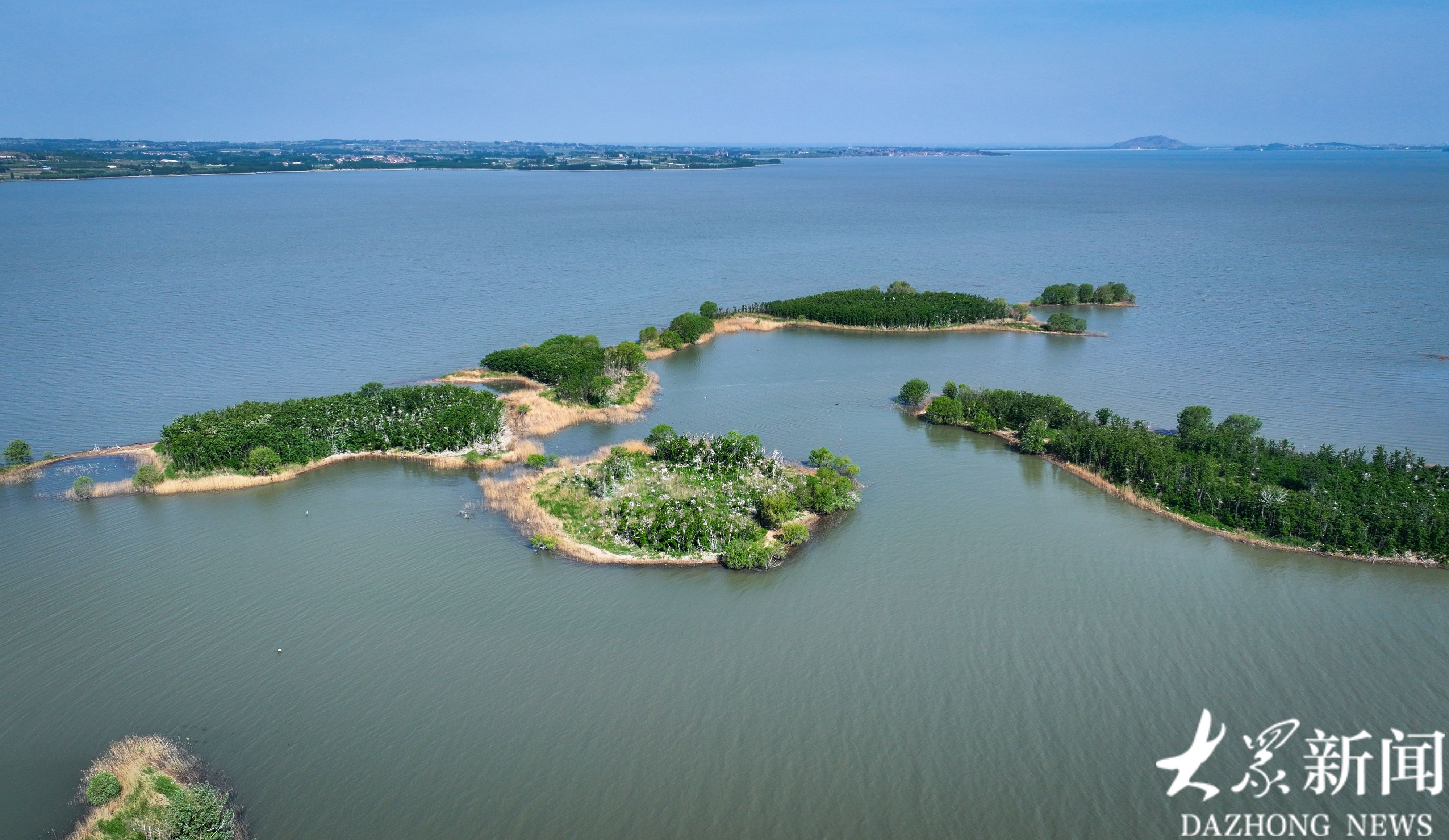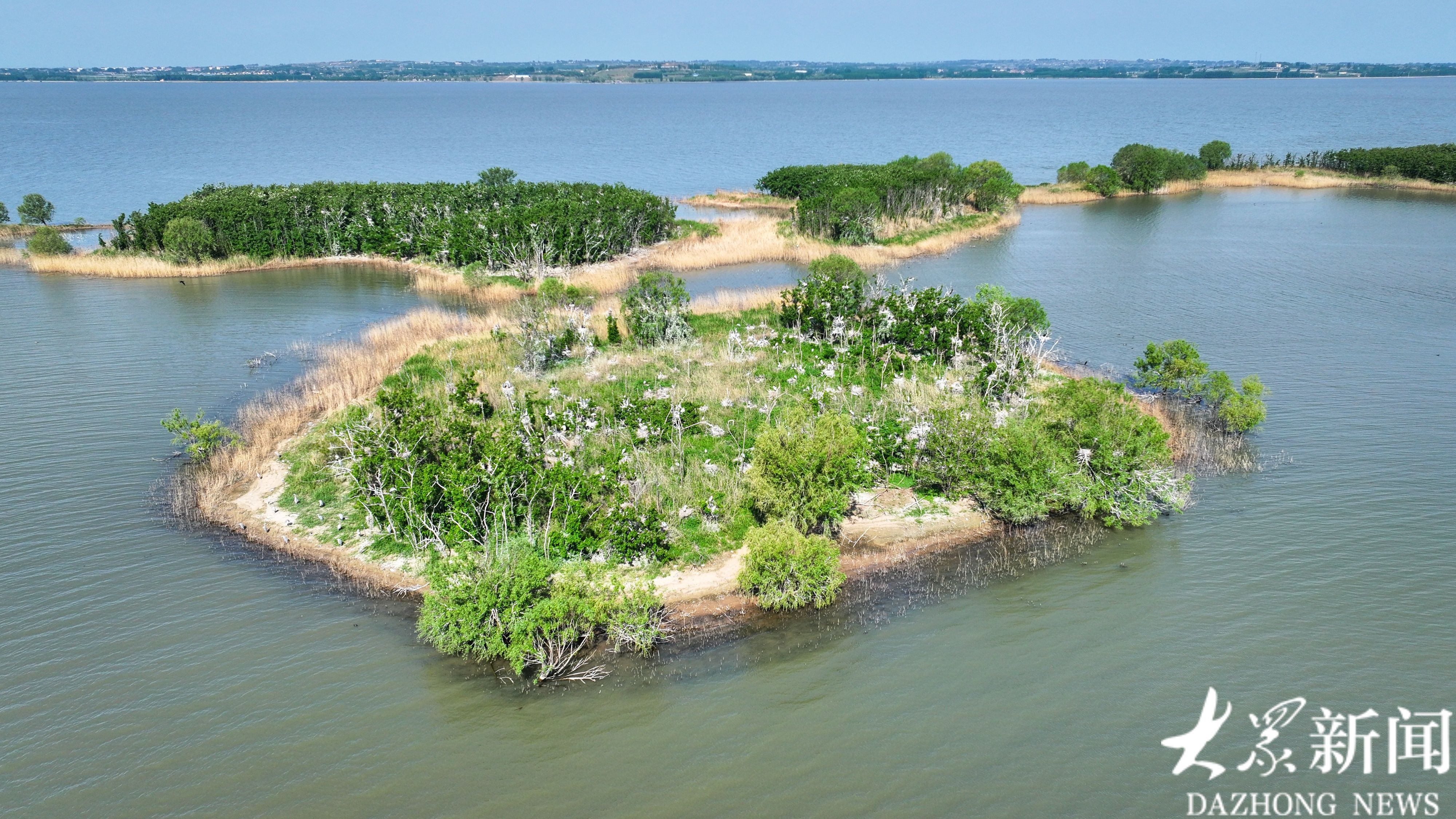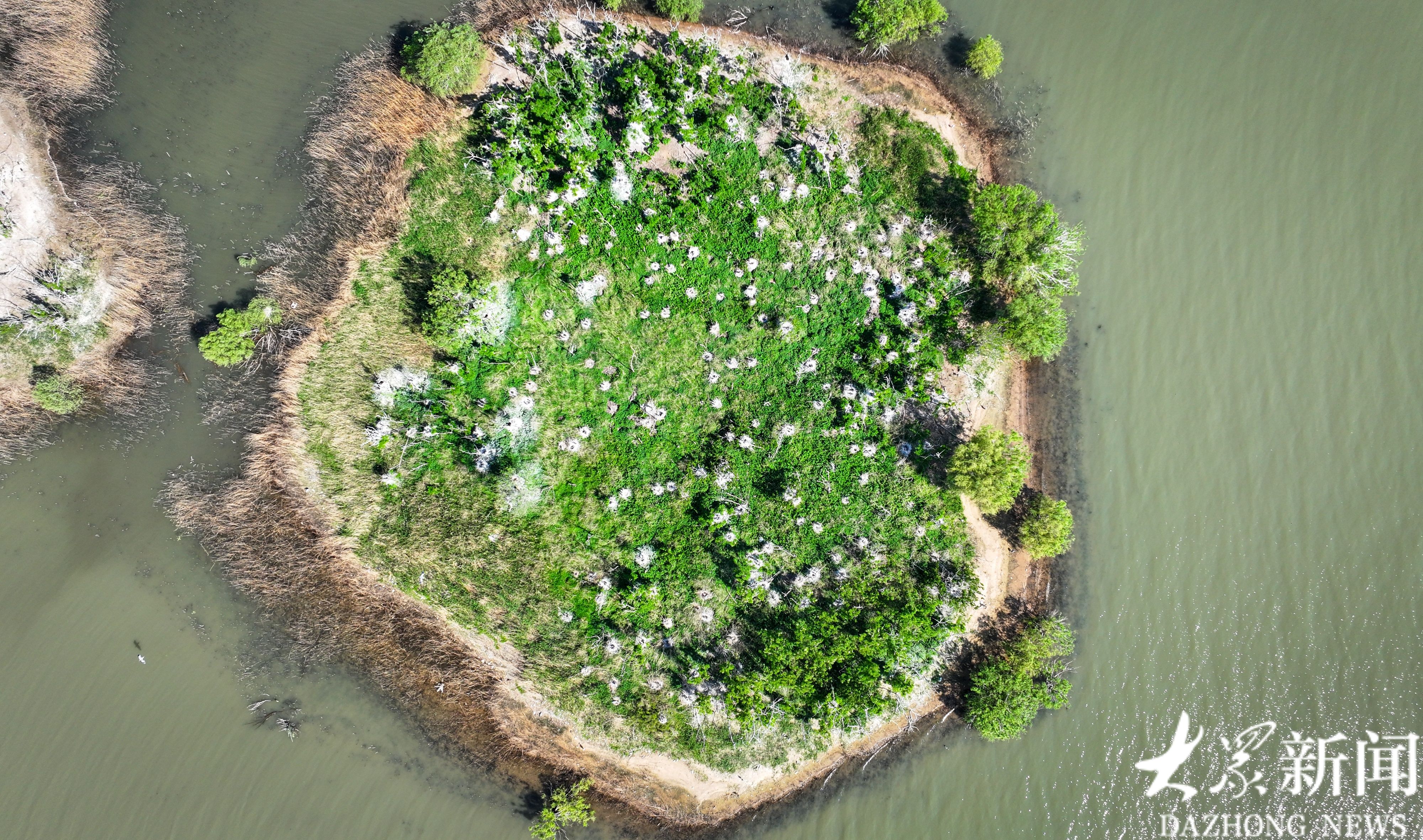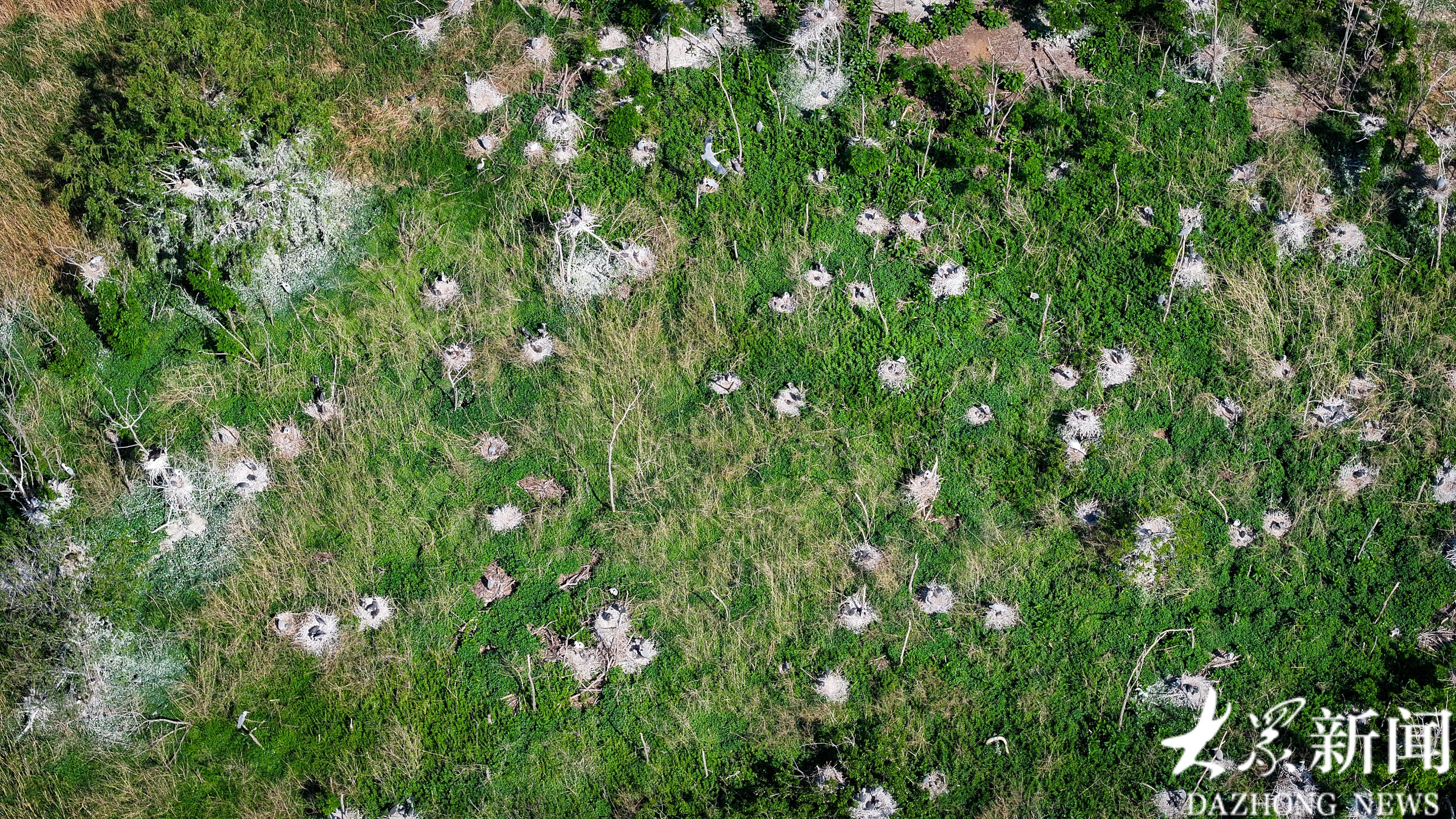 4月28日,潍坊峡山湖国家湿地公园湖心沙洲,成群苍鹭、鸬鹚等野生水鸟聚集栖息、筑巢繁育,形成大型育雏种群,景象壮观。