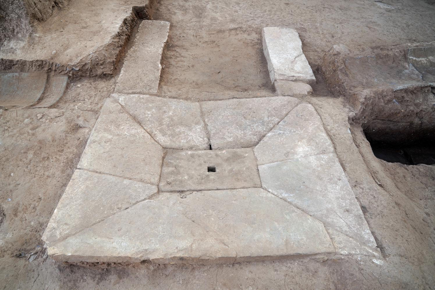 在山顶建筑基址,考古队员发现了一件地漏,它由多块长方形、梯形、三角形石板严密拼合而成,石板从四边向中间缓缓下倾,形成规整的坡度,正中间凿有方形下水孔洞,整体呈方形漏斗状。地漏表面打磨平整,拼接缝隙严密,既能快速汇集室内雨水与生活废水,又能防止泥沙渗漏堵塞管道,其设计原理与现代建筑地漏高度相似,是秦代建筑实用性与科学性完美结合的典范。地漏下方直接连接地下陶制排水管道,形成室内排水的核心通道。地下排水管道是整个系统的 “血脉”,采用陶管套接、分级埋设的方式,在夯筑台体时同步预埋。管道分为单列、双列、三列并排等多种形式。陶管接严密,接口与管道外壁均包裹纯净黏土,起到防渗、加固、防坍塌的作用。管道入口处设置镂孔砖,可有效过滤枯枝、泥沙等杂物,防止管道堵塞。