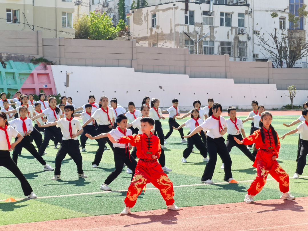 幼儿园的小朋友们带来联合器械操,篮球、凳子、彩虹伞相映成趣,稚嫩身影灵动可爱,尽显童真童趣与协作之美。山东路小学学子气势昂扬,一套武术操刚劲有力,展现少年意气与家国情怀。中央商务区实验学校绳操轻快灵动,节奏明快、整齐划一,尽显校园活力。辽源路小学筷子操独具韵味,将传统文化与体育韵律完美融合。东胜路小学“马上快乐”韵律操阳光向上,快乐运动的气息扑面而来。国开实验学校搏击操热血澎湃,力量与节奏感兼具,点燃现场氛围。第五十三中学太极扇展演刚柔并济,一招一式舒展大方,尽显中华传统武术文化的独特魅力。