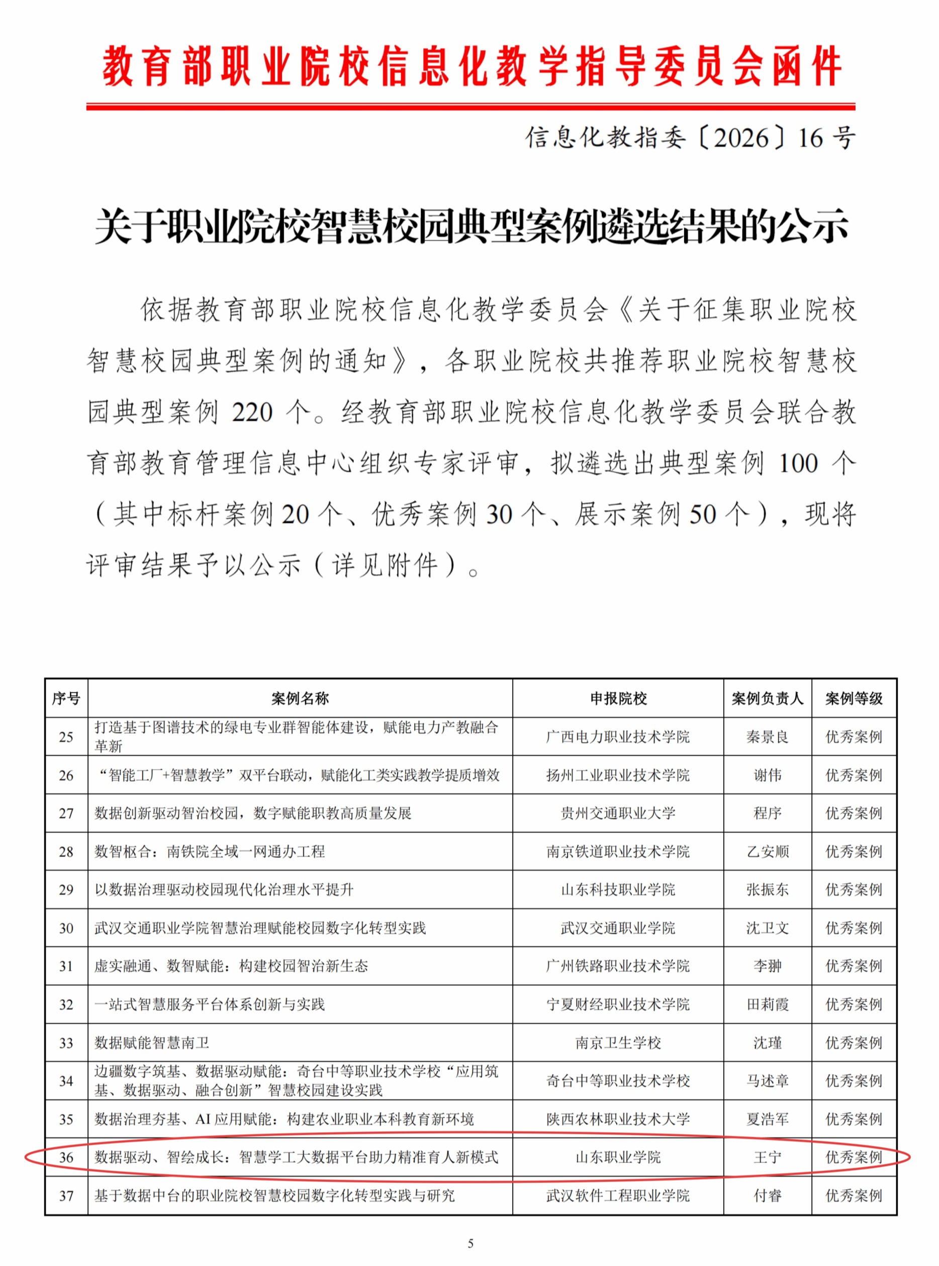 近日,教育部职业院校信息化教学指导委员会发布了《关于职业院校智慧校园典型案例遴选结果的公示》。山东职业学院东岭书院院长王宁报送的《数据驱动、智绘成长:智慧学工大数据平台助力精准育人新模式》成功入选“优秀案例”。