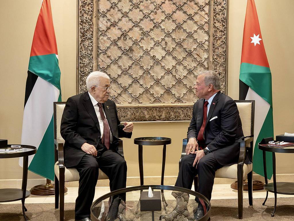 △当地时间4月28日,约旦国王阿卜杜拉二世(右)在约旦首都安曼会见巴勒斯坦总统阿巴斯(左)