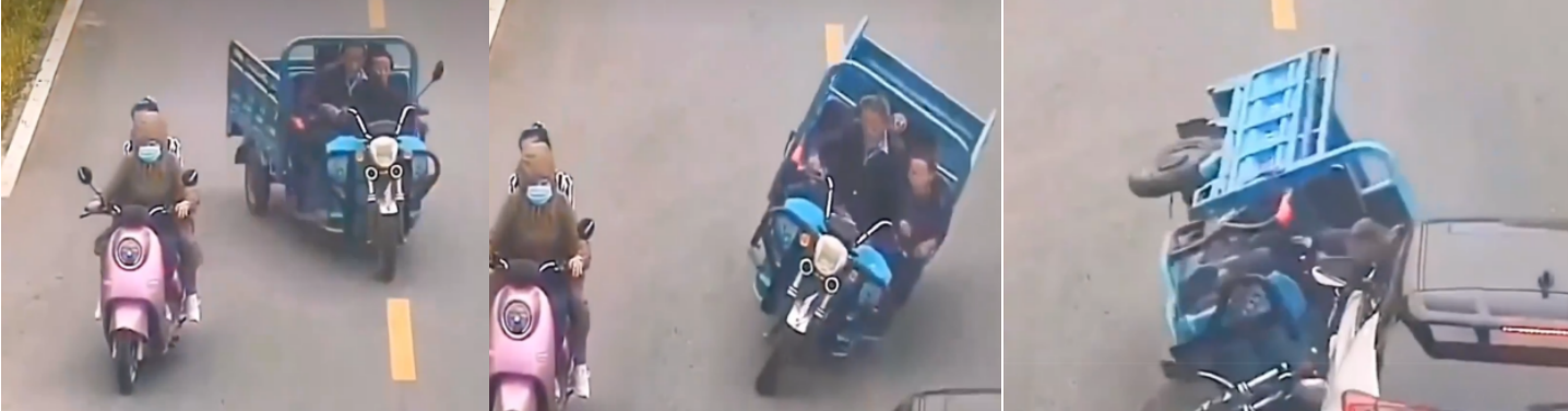 机动三轮车因两轮间距窄,横向稳定性先天不足,而载人、载货又会使车辆重心升高,行经急弯、陡坡、湿滑路面时,极易出现车身失控、侧翻情况,多人混乘、高位载货还会进一步加大侧翻概率,易造成驾乘人员伤亡及周边车辆、行人损伤。