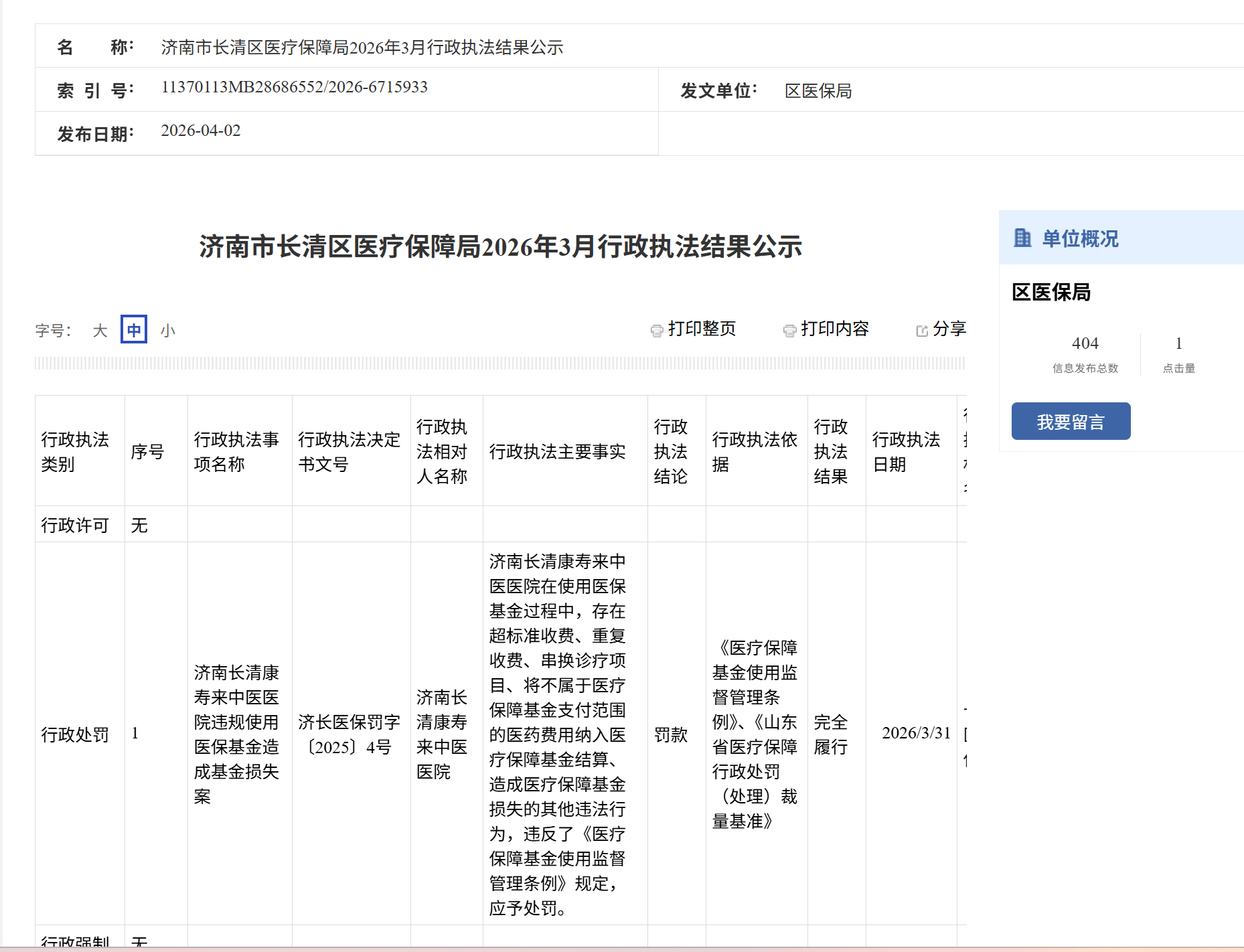 依据《医疗保障基金使用监督管理条例》《山东省医疗保障行政处罚(处理)裁量基准》,长清区医保局对济南长清康寿来中医医院作出罚款的行政处罚,该医院已完全履行处罚决定,处罚日期为2026年3月31日,执法文书号为济长医保罚字〔2025〕4号。