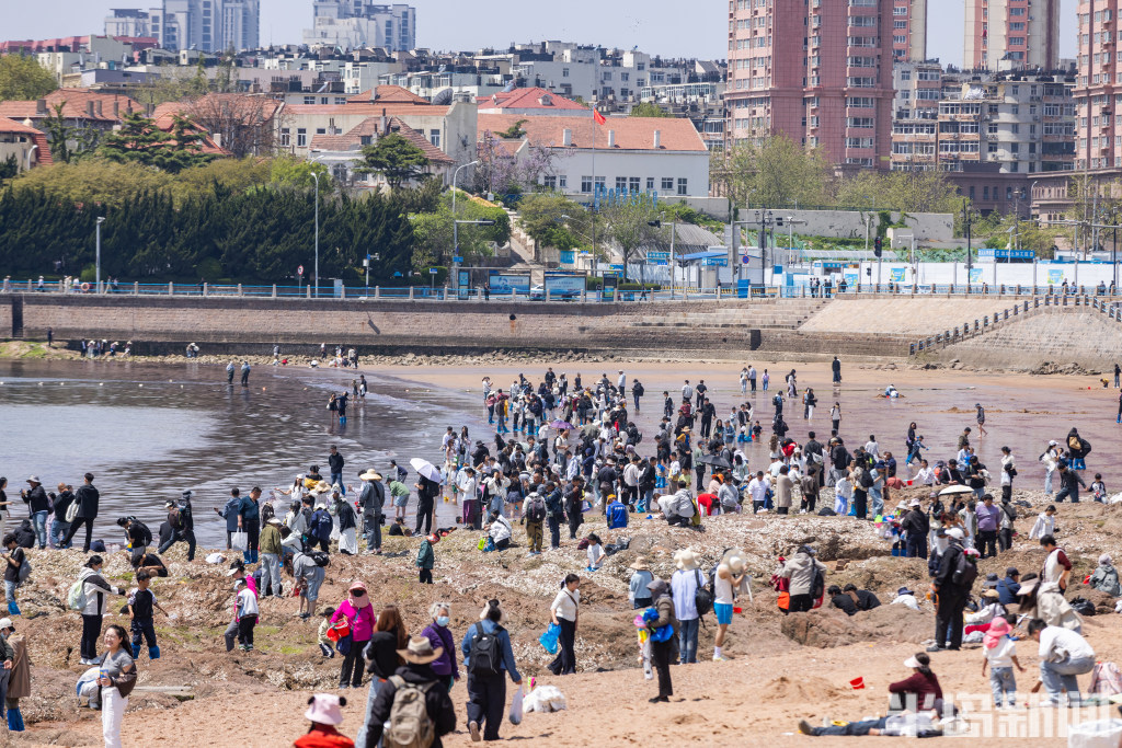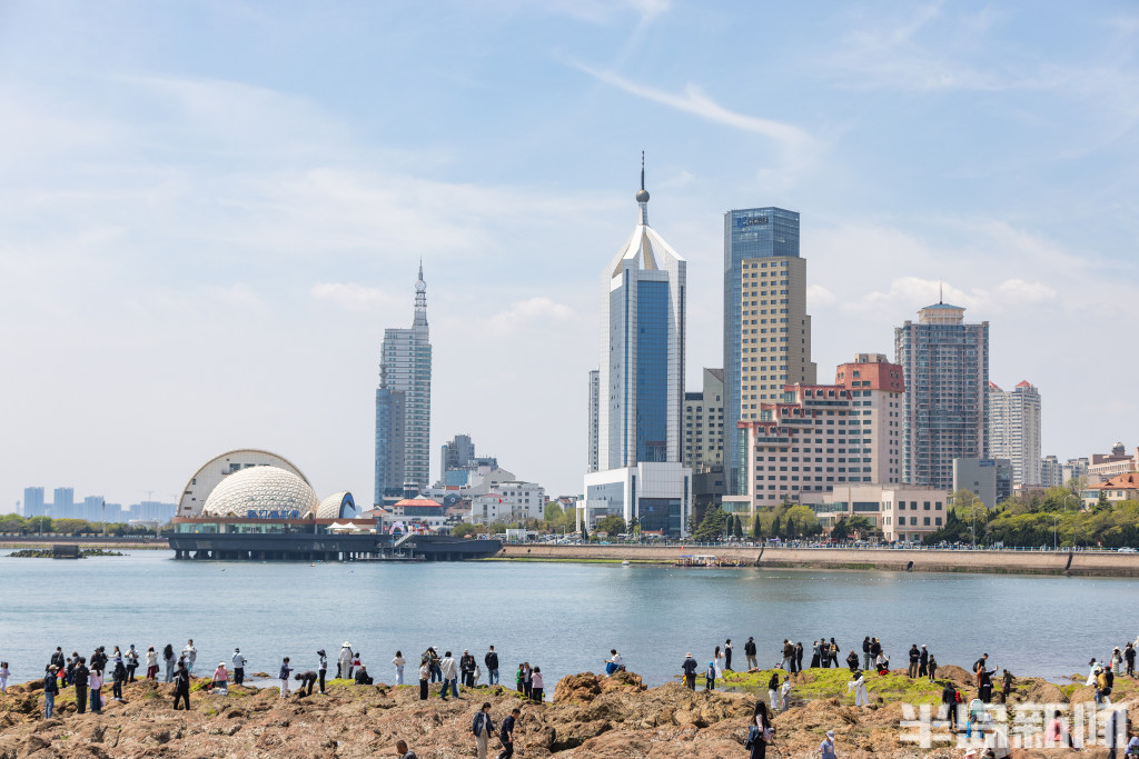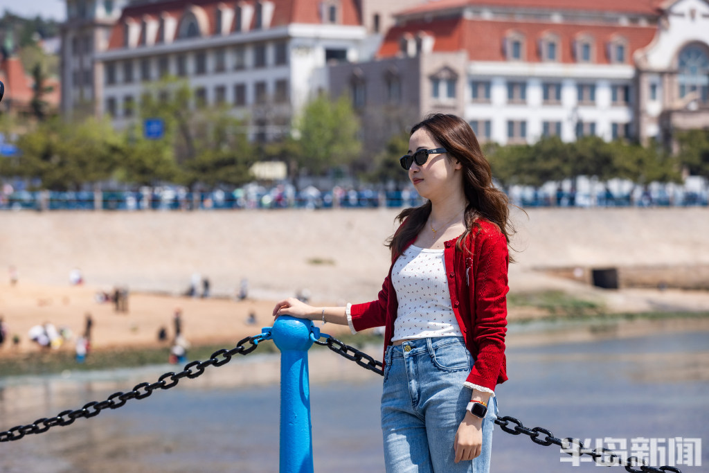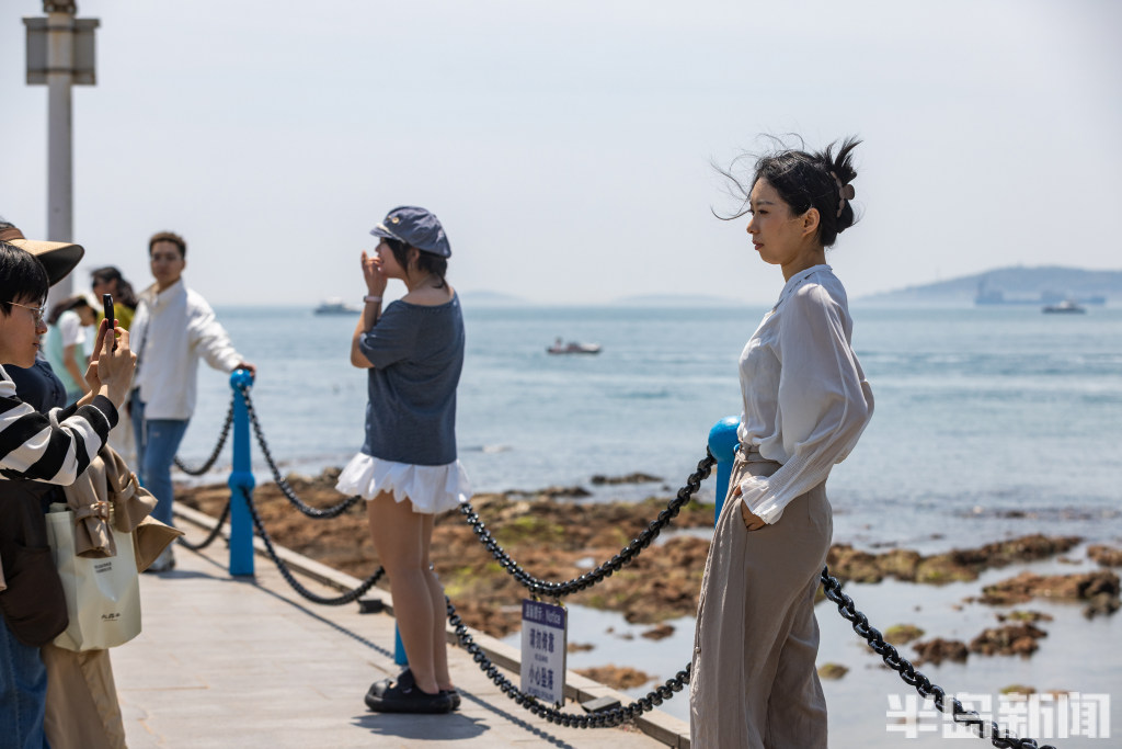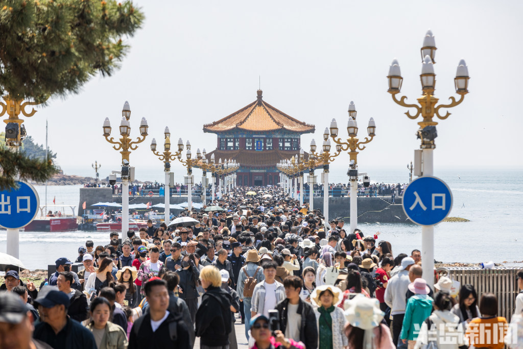 4月29日,青岛栈桥景区,大批游客来到这里休闲游玩,海滨很是热闹。五一假期临近,作为青岛标志性景点的栈桥目前已呈现游客络绎不绝的场面。当日,青岛湾畔游人如织,六浴等海滩上也是遍布游客的身影。
