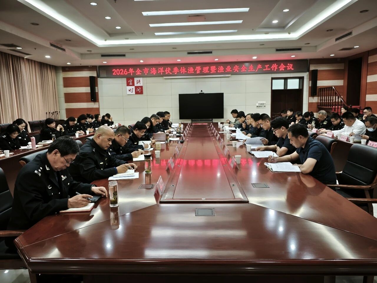 会议宣读了《2026年东营市海洋伏季休渔管理工作实施方案》。沿海各县区、功能区渔业主管部门相关负责同志,市海洋和渔业监督监察支队全体干部职工参加会议。
