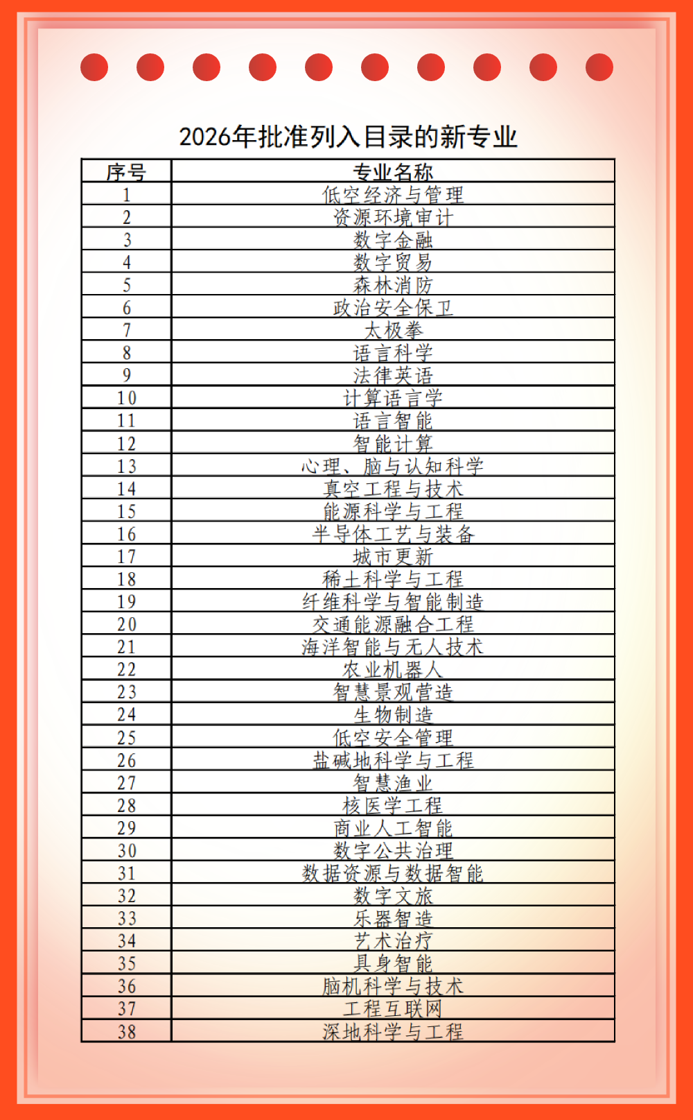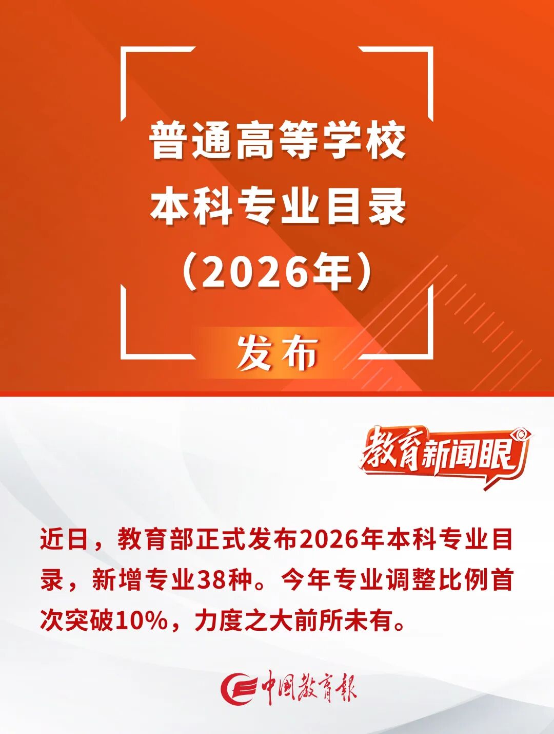 近日,教育部正式发布2026年本科专业目录,新增专业38种。“十四五”期间,全国高校新增本科专业布点1.02万个、撤销或停招1.22万个,累计调整比例超30%,今年专业调整比例首次突破10%,力度之大前所未有。