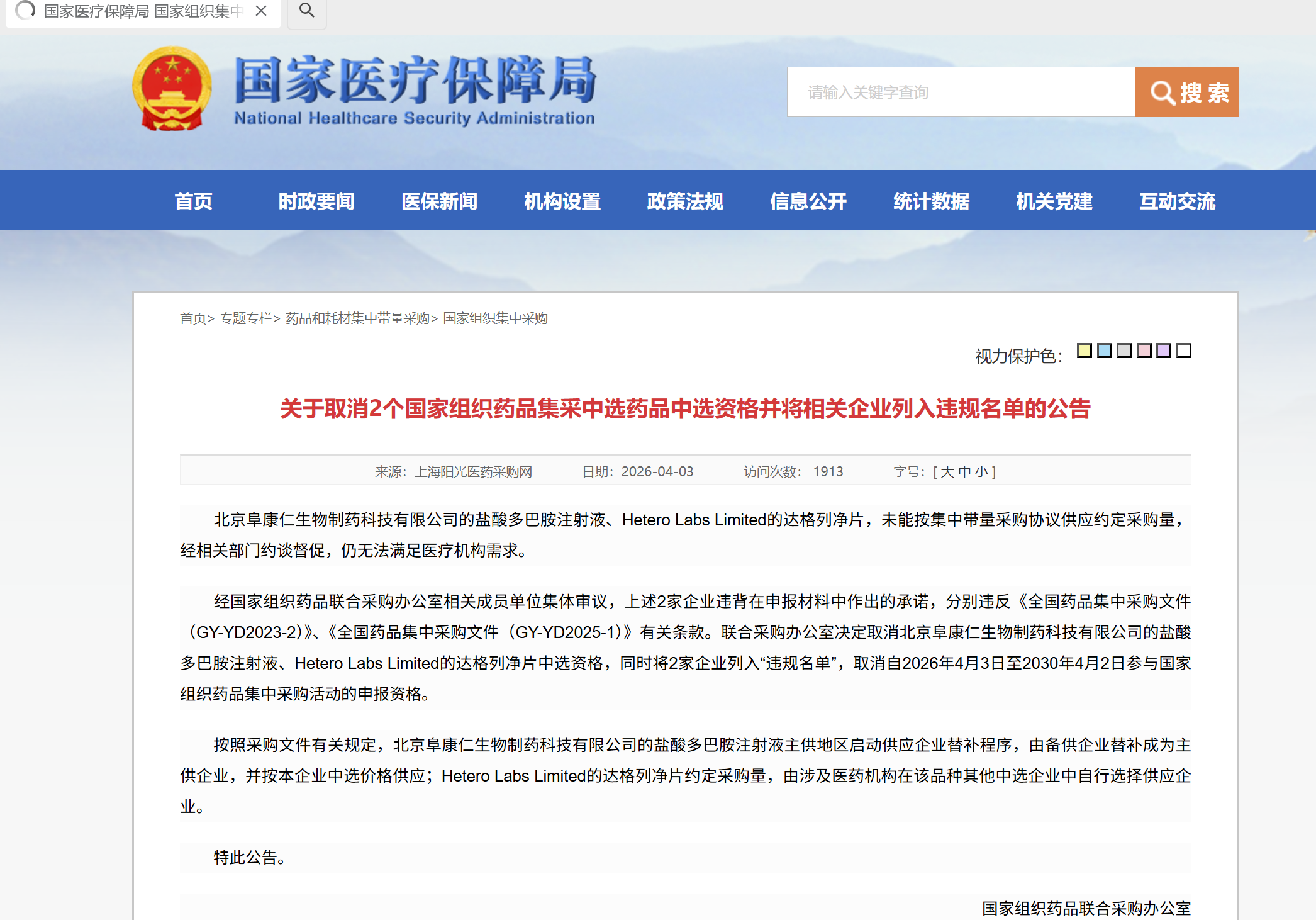 近日,国家组织药品联合采购办公室(以下简称“联采办”)发布公告,对两家未能履行供应承诺的药企开出重磅罚单:北京阜康仁生物制药科技有限公司(盐酸多巴胺注射液)与印度Hetero Labs Limited(达格列净片)被取消中选资格,同时列入集采“违规名单”,自2026年4月3日起,4年内禁止参与国家药品集采 。此次惩戒创下近年国采对供应违约企业的处罚时长纪录,释放出集采“重合同、保供应、严监管”的强烈信号。