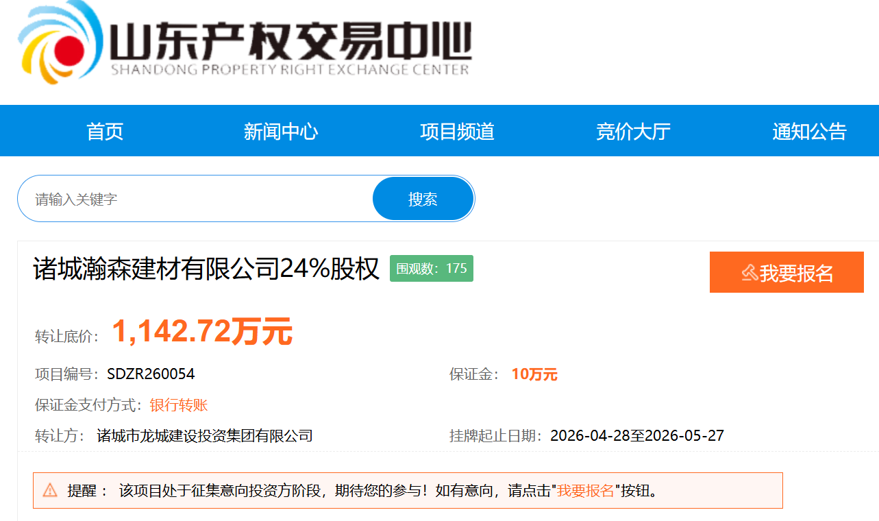 近日,诸城瀚森建材有限公司(下称“诸城瀚森建材”)24%股权在山东产权交易中心挂牌转让,转让底价为1142.72万元,转让方为诸城市龙城建设投资集团有限公司(下称“诸城龙投”)。